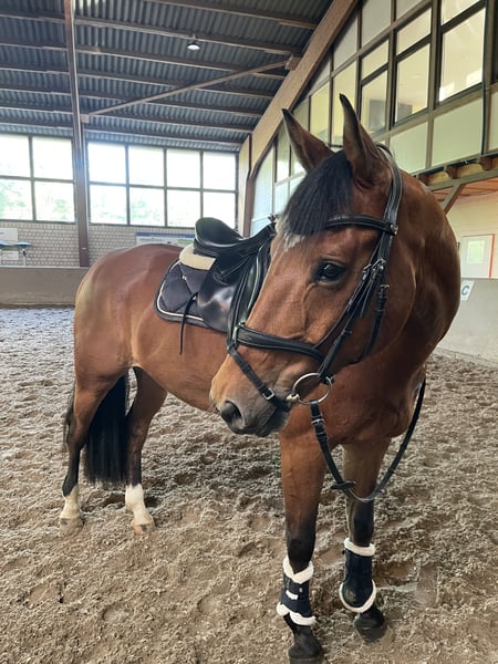 Schweren Herzens geben wir unseren 13-jährigen Wallach ab, der sich seit seinem fünften Lebensjahr in unserem Besitz befindet. Er wurde größtenteils von einer jungen Amateurreiterin ausgebildet und auf Turnieren bis M*-Springen vorgestellt, wobei er Platzierungen bis zur Klasse L erreichen konnte. Sein Herz schlägt für den Springsport. Er geht mit viel Motivation in den Parcours und ist stets fair zum Reiter, was ihn zu einem guten Lehrpferd macht. In der Dressur zeigt er drei solide Grundgangarten und beherrscht Lektionen bis zur Klasse M. Er wurde gelegentlich in A- und L-Dressuren vorgestellt und konnte auch hier die ein oder andere Platzierung in der Klasse A erreichen. In der täglichen Arbeit ist er sehr unkompliziert und macht viel Freude beim Reiten. Im letzten Jahr war er gemeinsam mit mir das erste Mal im Gelände unterwegs, wo er sich ebenfalls sehr brav und mutig in der Gruppe zeigte. Der ein oder andere Baumstamm stellte dabei kein Problem für ihn dar. Allgemein ist er ein sehr braves und erfahrenes Pferd, das mit viel Herz und Freude bei der Arbeit ist. Er freut sich über seine Freunde auf dem Paddock oder der Wiese, ist verspielt und wird auch gerne gekrault. Auf dem Turnier ist er ebenfalls super unkompliziert im Umgang und hat keine Probleme mit vollen Abreiteplätzen oder einem Traktor, der neben ihm den Boden abzieht. Wir geben ihn ab, da ich es neben dem Studium zeitlich leider nicht mehr schaffe, den Reitsport weiterzuführen. Wir hoffen, dass er ein tolles Zuhause findet, in dem er geliebt wird und sein schönes Leben weiter genießen kann. Er war in all den Jahren bei uns immer gesund und zeigt keinerlei Unarten. Für Videos und weitere Fragen können Sie sich gerne melden.