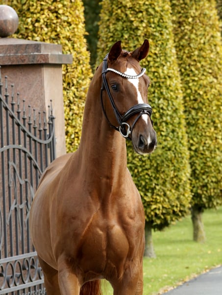 Highly modern young horse with a stunning, colorful chestnut coat and harmonious conformation. Equally well-bred with excellent quality, suitable temperament, and a strong, encouraging drive. Well-socialized, healthy, and raised in an appropriate manner, gently and sensitively backed. An exceptionally promising dressage athlete for ambitious riders and those seeking a standout performer. With a current, good TÜV – directly from the breeder.