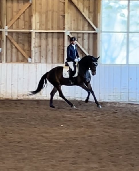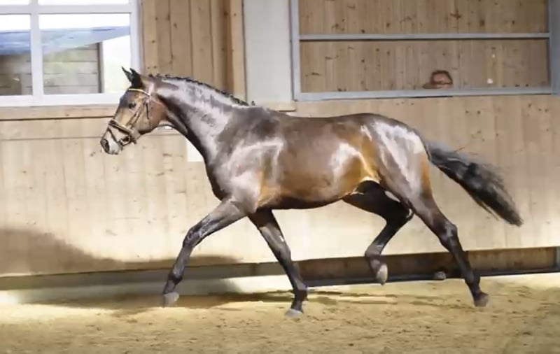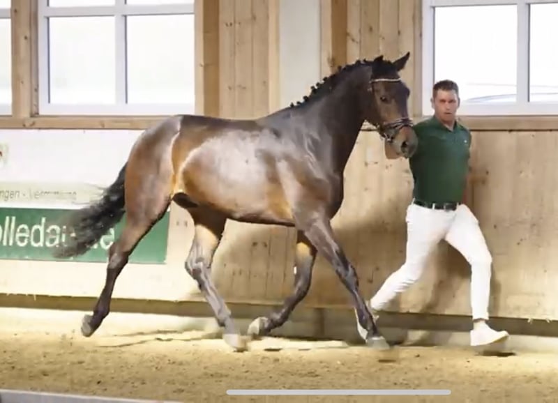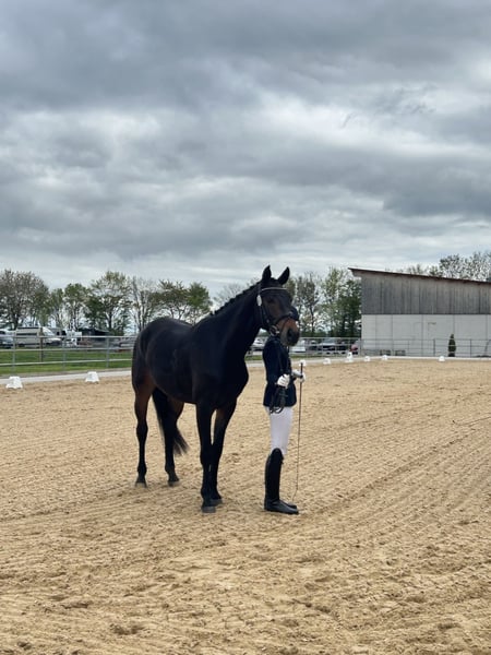 Breed: Hanoverian Gender: Gelding Year of Birth: 2021 Color: Dark Brown Height: currently 172 cm Lineage: For Dance X Florestan I Discipline: Dressage For sale is the impressive Hanoverian gelding "Filou," born in 2021. With his elegant dark brown coat and a current height of 172 cm, he is a true eye-catcher. This talented gelding shows great potential in dressage and has already placed in the riding horse test. Filou impresses with his appealing movements and his willingness to learn. He is well-mannered and demonstrates cooperation and reliability. He is ideally suited for an ambitious rider looking for a promising partner for a successful future in competitive dressage. If you are interested or have further questions, please feel free to contact me. Reachable at: +4915560581906 Preferably via WhatsApp or call. A trial ride is possible.