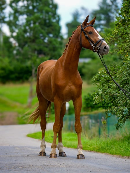 Prachtig paard, gemakkelijk, altijd voor de benen. Dressuurpaard met een hoog potentieel maar gemakkelijk in de training, ook voor een amateur die mooie proeven wil rijden. Gouden karakter.