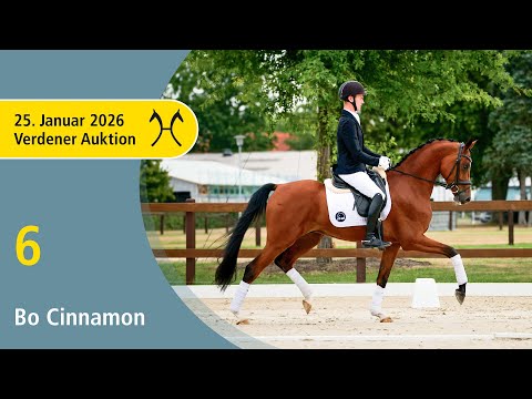 Bo Cinnamon ist eine erstrangige Dressurspitze mit vorzüglichen Grundgangarten. Er formt sich blendend und strebt aufgrund der optimalen Begabung das große Viereck an. Großmutter Woman on Top O stellt die beiden gekörten Hengste Fürstenherz v. Fürstenball und Frisco v. Fürstenball sowie fünf weitere Nachkommen, die erfolgreich im Sport sind, darunter ein Sohn des Sarkozy (DRE: S-erfolgreich mit Kahra Alena Baumann). Sportname: Best Selection G 2. Generation Sportpferde Dressur: Fürstenwelt v. Fürst Nymphenburg (DRE: S* mit Sabrina Geßmann); Saint Laurent 5 v. Sarkozy (DRE: S* mit Kahra Alena Baumann,FoVA 2012). Aufbauprüfungen Dressur: gek. Hengst Fürstenherz/v. Fürstenball v. Fürstenball (DRE: M mit Nina Kudernak,Verden 2013,HM 2013); gek. Hengst Frisco/Frisco 174 v. Fürstenball (DRE: L,Verden 2014). Auktionspferde: Lorca/v. Lemony´s Nicket v. Lemony's Nicket (VA 2015). Bes. Prämientöchter: StPr Starlight O v. Stedinger (Louis Wiegels-Schau Sandbostel 2008). 3. Generation Sportpferde Dressur: gek. Hengst Sean Connery/Sean Connery 5 v. Sir Donnerhall I (DRE: Grand Prix mit Therese Nilshagen,Dressurpferdeprfg. Kl.M Bundeschampionat 6 jährige 2013,Bundeschampionat f. Reitpferde 2010,Vechta 2010,VA 2009: 195.000 €); Her Highness O/Her Highness O. v. Hohenstein (DRE: S*** mit Signe Kirk KRISTIANSEN,GPS - Grand Prix Special 2020,GP - Grand Prix 2020,GPS - Grand Prix Special 2019,GP - Grand Prix 2019,GPS - Grand Prix Special 2019,GPS - Grand Prix Special 2019,GPS - Grand Prix Special 2019,GPS - Grand Prix Special 2014,GPS - Grand Prix Special 2014,GP - Grand Prix 2014,FEI Grand Prix Special 2014,FEI Grand Prix 2014); v. Sandro Hit (DRE: S** mit Kate COWELL); Donner O v. Don Schufro (DRE: S* mit Frank Lange); Sean Connery 8 v. Sir Donnerhall I (DRE: S* mit Sascha Schulz,Championat f. Reitpferde 2014); Fille d´amour GMO v. Festus GMO (DRE: M** mit Anna Font); Blind Date O v. Bordeaux (DRE: M** mit Lea Haß); HannPr Donna Valentina/Donna Valentina O v. Don Schufro (DRE: M* mit Frank Lange); Bel Ami O v. Bordeaux (DRE: M* mit Sonja Steves). Sportpferde Voltigieren: Fenia/Fräulein Flori v. Fürst Romancier (Voltigieren: S* mit VG Breitenburg I). Aufbauprüfungen Dressur: Merlin 1896 v. Morricone I (DRE: L); gek. Hengst World Diamond O/v. White Star v. White Star (DRE: L,Verden 2000). gekörte Hengste: gek. Hengst Weltjunge/Weltjunge v. Weltmeyer (Vechta 2000). Auktionspferde: Sean Connery III v. Sir Donnerhall I (VA 2022,FoVA 2018); Vollmond O/v. Vitalis v. Vitalis (VA 2020); Donnerspon v. Don Frederico (FoVA 2008). Bes. Prämientöchter: HannPrA Frieda CS v. For Romance I; StPr Snap Dragon v. San Amour I; StPr Scarlett O/She's a Lady O v. Stedinger; StPr Weltmädchen O v. Weltmeyer; StPr Highlight O v. Hohenstein; StPr World Dream O/World Dream O v. White Star; StPr River Queen O v. Rotspon (Ratje Niebuhr-Schau Verden 2002); StPr Wild Lady O v. Weltmeyer. 4. Generation Sportpferde Springen: gek. Hengst Friesenstern/Friesenstern 1 v. Wanderer (SPR: 1,30 m mit Annika Jagels,Verden 1989). Aufbauprüfungen Dressur: Malu/Malu 5 v. Matcho (DRE: L). Bes. Prämientöchter: StPr Matcho's Girl O v. Matcho. 5. Generation Sportpferde Dressur: StPrA Wiventy v. Wittinger (DRE: M** mit Olaf Nowak,VA 1999). Sportpferde Springen: Matcho King v. Matcho (SPR: M mit Veser,Claus). Aufbauprüfungen Dressur: Louis Feraud v. Lemon Park (DRE: L,VA 1995). Bes. Prämientöchter: StPr Prestige v. Pik König. Mutter: Great Woman G Prämierung: 1xIa. ZL: 5/3 Großmutter: Woman on Top O ZL: 14/12 Das Pferd ist ein Verdener Auktionspferd und wird am 25.01.2026 online versteigert. Vom 12.01. bis zum 25.01. kann das Pferd jeden Tag beim öffentlichen Training besichtigt und ausprobiert werden. Das Startgebot bei der Versteigerung ist 8.000 Euro.