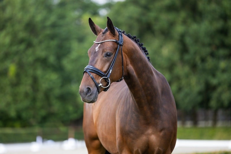 Denton es un semental de 5 años con tres aires de calidad y una excelente ética de trabajo. Es fácil de manejar, ansioso por complacer y muestra una gran montabilidad tanto en el entrenamiento diario como al aprender nuevos ejercicios. A pesar de su joven edad, Denton ya está trabajando con confianza en los cambios de pie y ejercicios para las clases de 6 años. También ha comenzado a trabajar de manera más recogida, incluyendo los primeros pasos hacia la piaffe, demostrando equilibrio, talento y concentración. Con su sólida base y habilidad natural, Denton es una perspectiva emocionante para un jinete que busca desarrollar un caballo de deporte de alto nivel para el futuro.