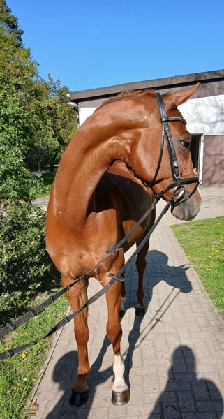 Tai is a very charming and friendly young horse. Bloodlines and very elegant. Gently backed and directly from the breeder, all doors are open to him. He is very comfortable and soft in the hand, always has a good forward movement, and is eager to work. He is also very easy to sit. We see him as a lovely horse for transitioning or for ladies. Since he is a bit more delicate and smaller, he was backed at the end of his fourth year. He has not yet been exposed to competition atmosphere. He enjoys hacking out, preferably in company. A very recent health certificate is available! Absolutely herd-proof. No prior health issues. Please call or message directly at 0172 8694703.