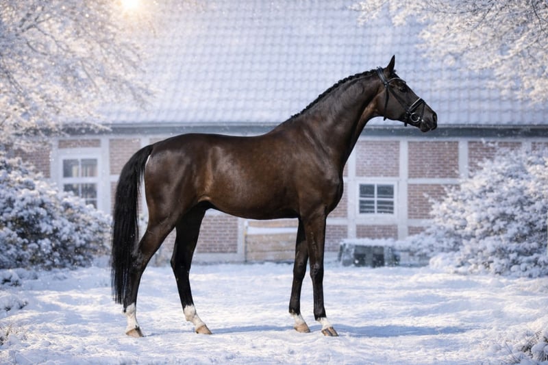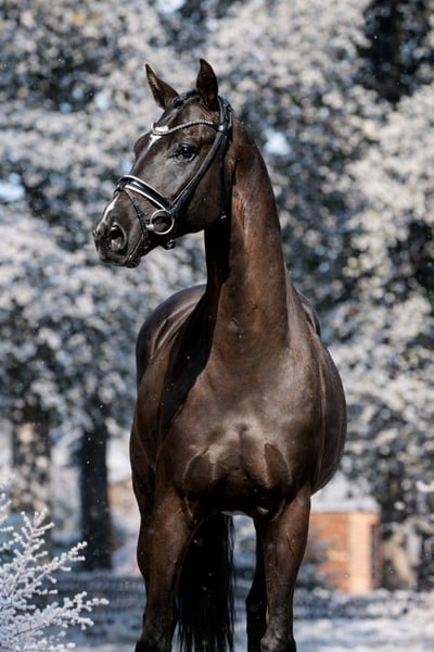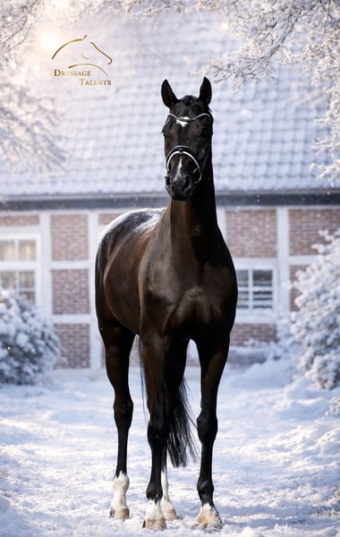 Jet black sport horse that leaves nothing to be desired! Elegant, agile mare with optimal markings and a successful sporting career. A pleasing and tasteful movement talent with natural rideability and a high-quality basic build. Powerful in the frame with quick hindleg action, well-connected behind, and natural impulsion — combined with maximum self-carriage, a clear mind, and unwavering ambition. These desirable traits highlight the potential career of this already highly decorated athlete, who has achieved top placements up to the S-level dressage classes. GP-level movements are already quite well established at training level. An eye-catching young horse with magnetic presence, offering limitless potential in the right hands. Direct from the breeder, with an impeccable pedigree and a clean health certificate.