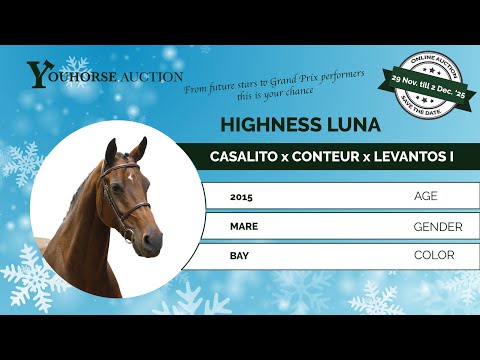 Die zehnjährige Highness Luna ist eine wunderschöne Stute, die sich hervorragend reiten lässt. Sie verfügt über eine elegante Springtechnik, überspringt mühelos hohe Hindernisse und eignet sich auch gut für einen Amateurreiter. Ein liebenswertes und kooperatives Pferd, um gemeinsam Freude am Reiten zu haben. Vater Casalito (Springen bis 1,50 m) ist ein Holsteiner Hengst von Casall aus einer Halbschwester von drei Grand-Prix-Pferden mit 1,60 m. Mutter Sarina I (Conteur x Levantos I) stammt aus einer Zuchtlinie, die bereits mehrere Springpferde im Bereich von 1,50 bis 1,60 m hervorgebracht hat.