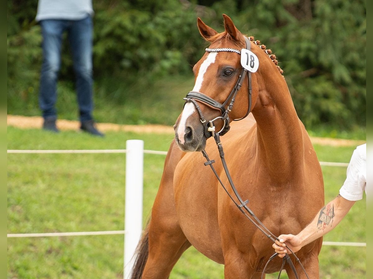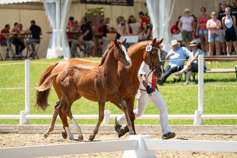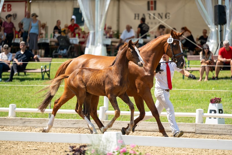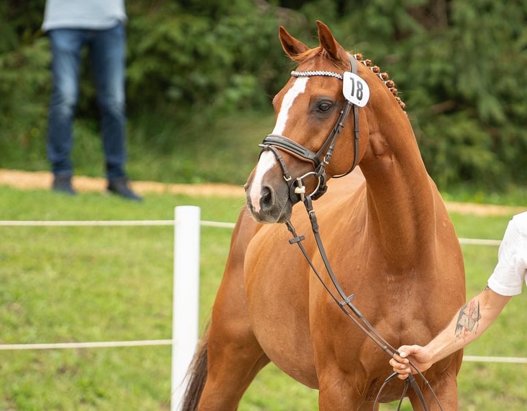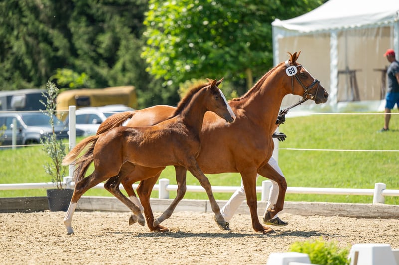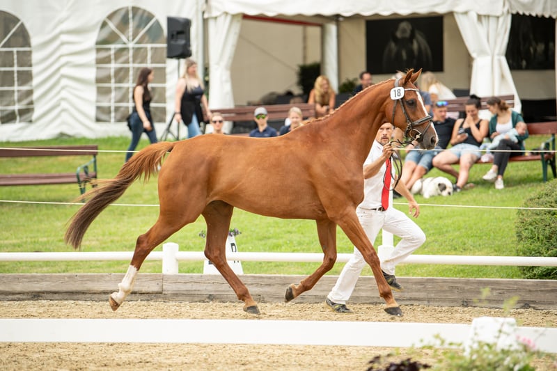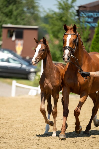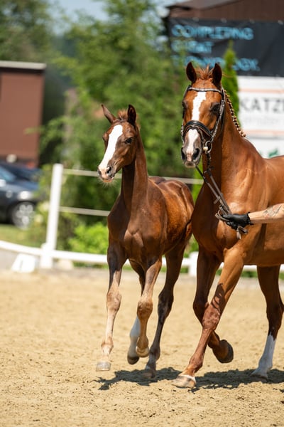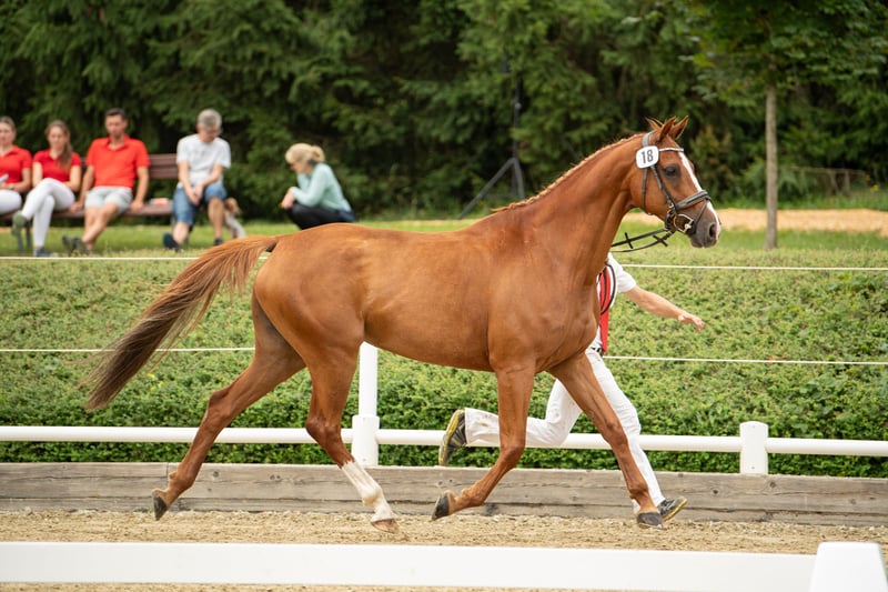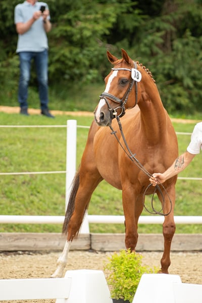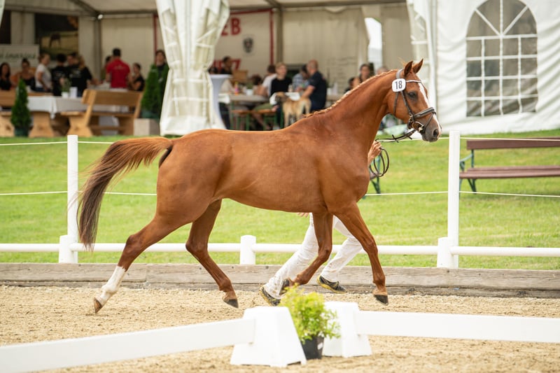 Ta elegancka klacz pochodzi od Uriko x Caretino x Rebel Z, jest pełna jakości i energii, a w 2024 roku miała już źrebię. Samodzielnie wytrenowałem ją jako 4-latkę, a na turniejach startowała do 1,20 m. Przy skokach wykazuje ostrożność, dużą pewność siebie i zapał. Technicznie opanowała ćwiczenia do klasy L, jest bardzo delikatna w jeździe, głównie za pomocą siodła. Podczas pracy na ujeżdżalni jest bardzo ambitna i zmotywowana, nie radzi sobie dobrze z presją jeźdźca i jest przeznaczona tylko dla doświadczonych jeźdźców. Miała już piękne źrebię od Keatona. Zarejestrowana jako klacz hodowlana w Austrii z doskonałą oceną 7,71 punktów, co jest naprawdę imponujące jak na pochodzenie skoncentrowane na skokach. Ponieważ wycofuję się z jeździectwa, a moje serce należy do koni północnoniemieckich, postanowiłem ją oddać.