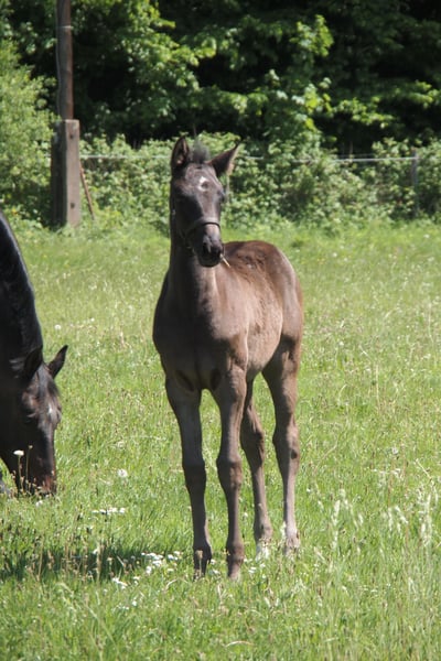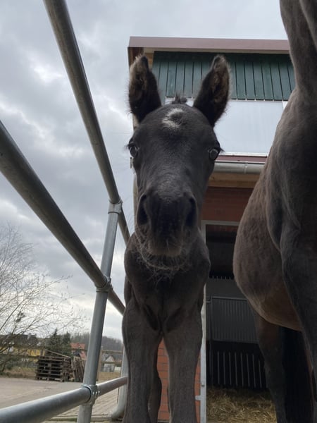 We are currently looking for a new home for our mare "Mooni." She was born at our stable in 2022 and, after weaning, enjoyed excellent upbringing on pasture in a herd of mixed ages. Throughout this time, she has proven to be consistently social and well-behaved. She is familiar with lunging and tacking, and has had initial exposure to rider weight. We are seeking an experienced new owner who will continue her training. Current X-rays can be provided upon request, as well as videos showing "Mooni" in motion. For further questions, please feel free to contact the phone number listed below. (The last two pictures show the mare as a foal and also the reason behind her name. Her distinctive mark still looks exactly the same today.)