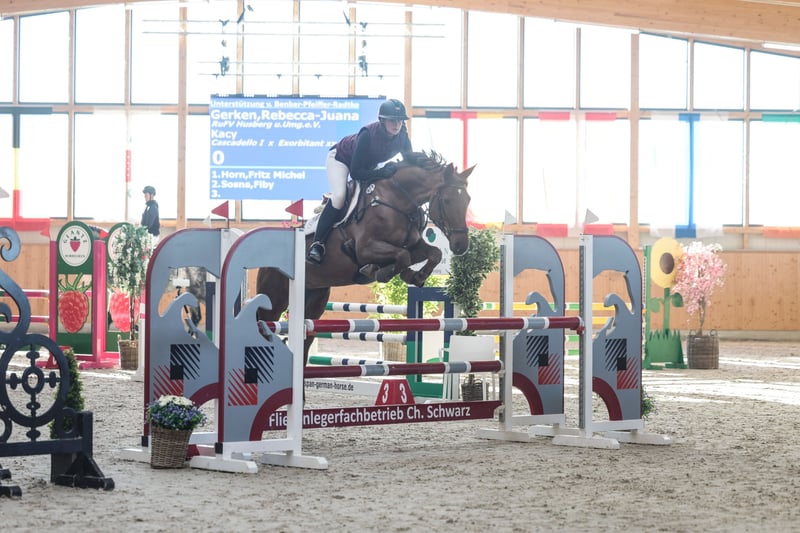 Kacy es una yegua de ocho años con muchas cualidades. Sin duda, su principal enfoque está en el salto de obstáculos. Debido a su personalidad, que combina sensibilidad y fortaleza, necesita una mano firme y límites claros, por lo que no es necesariamente un caballo para niños. Ha sido montada con suavidad, aunque requirió bastante tiempo para relajarse con el jinete. Actualmente, hemos establecido nuestras rutinas y ya no hay problemas. En el salto, es enérgica y cautelosa, a veces aún un poco desconfiada. En casa, podemos completar un recorrido de nivel L, y en competición ha sido clasificada hasta en saltos de nivel L, aunque todavía ha participado en pocas pruebas. Si buscas un compañero para el salto de alto nivel, tienes experiencia con caballos jóvenes y estás dispuesto a seguir formando a un caballo con paciencia y calma, Kacy podría ser de tu agrado. Con gusto te cuento más si estás interesado. +49 152 33658660
