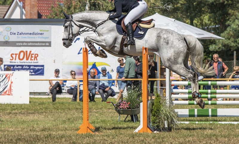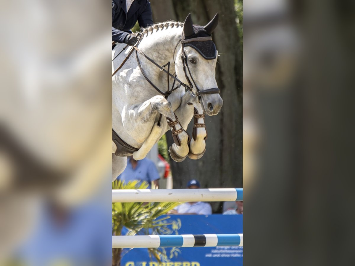 Stylish and well-behaved gray gelding seeking a new home. Cool Eckard impresses with his friendly and charming nature. He has achieved placements and successes up to the advanced level, but he has somewhat lost confidence in his rider. Therefore, he is looking for a new partner with whom he can regain his self-assurance and achieve new accomplishments. He has recent X-rays from one year ago, showing no significant findings. The only issue is his crooked pelvis, which he has had since birth. However, this has never caused any problems and is not expected to in the future. He is farrier- and loading-friendly and gets along well with other horses (he is part of a herd).