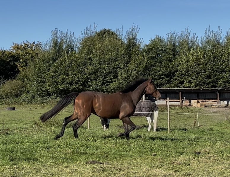 Zum Verkauf steht ein vielversprechender Holsteiner Wallach, geboren im Jahr 2022. Dieser elegante Braune hat ein Stockmaß von 1,70 cm und überzeugt durch sein sportliches Erscheinungsbild. Diego geht bereits an der Longe und ist am Boden gearbeitet. Horsemanship hat er ebenso kennengelernt und arbeitet hier konzentriert und motiviert mit. Im Gelände war er auch schon spazieren. Mit seiner schwungvollen Bewegungsart ist er ideal als gehobenes Freizeitpferd und bietet ebengleiches Potential sowohl fürs Springen und Dressur. Sein Vater gewann 2017 das Landeschampionat in SH (siehe Bild). Diego ist gelehrig und möchte gefallen. Vor allem möchte er gearbeitet und gefördert werden.. Gleichzeitig ist er sensibel und feinfühlig. Altersentsprechend testet er und braucht einen Reiter mit Erfahrung. Er wird roh zum selbst ausbilden verkauft. Nach einem großen Entwicklungsschritt in den letzten vier Monaten, ist er nun bereit für den Beritt und möchte loslegen. Diego ist ein Wallach mit einem treuen Wesen und Charakter der gefördert und entwickelt werden möchte. Er geht problemlos in der Wallachherde und kennt 24/7 Weide im Sommer sowie im Winter Box und Paddock. Bei Interesse oder weiteren Fragen stehe ich Ihnen gerne zur Verfügung. Besuchen Sie uns und überzeugen Sie sich selbst von diesem tollen Pferd! Er ist gesund und ohne bekannten Befund. Auf eigenen Wunsch kann eine AKU durchgeführt werden. Nur in beste Hände abzugeben - Platz vor Preis. Keine Händler oder Reitschulen.