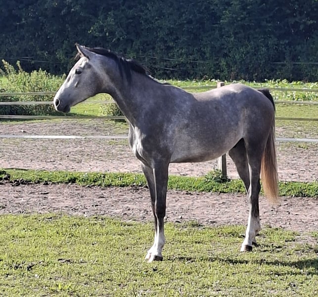 Holsteiner Gelding – A Promising Dressage Horse For sale is a beautiful Holsteiner gelding, born in 2023. He is ideally suited for dressage and already demonstrates considerable talent and willingness to learn. The young gelding impresses with his excellent pedigree, his friendly temperament, and his balanced nature. If interested or for further information, please feel free to contact me. This promising horse is looking for a dedicated rider who will nurture his potential and grow with him.