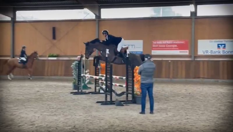 Lauriel Larimar × Caretino, foaled on May 28, 2022, Holsteiner gelding. He is currently being gently backed and can be seen in the video during his very first free jumping session. Holsteiner Olympic bloodline 741 (including Cardento, Leandro, Colorit, Click and Cash, Quintender, Coreandro). First free jumping and turnout in the arena and on the paddock. His dam is full sister to the 2018 licensed Holsteiner stallion Coreandro, who has competed successfully up to 1.45 m under Gerrit Flücken. His sire, Larimar, has produced several internationally successful offspring competing up to 1.60 m, including Lord Mexx, Larisal, Deleyn, and Ligretto.