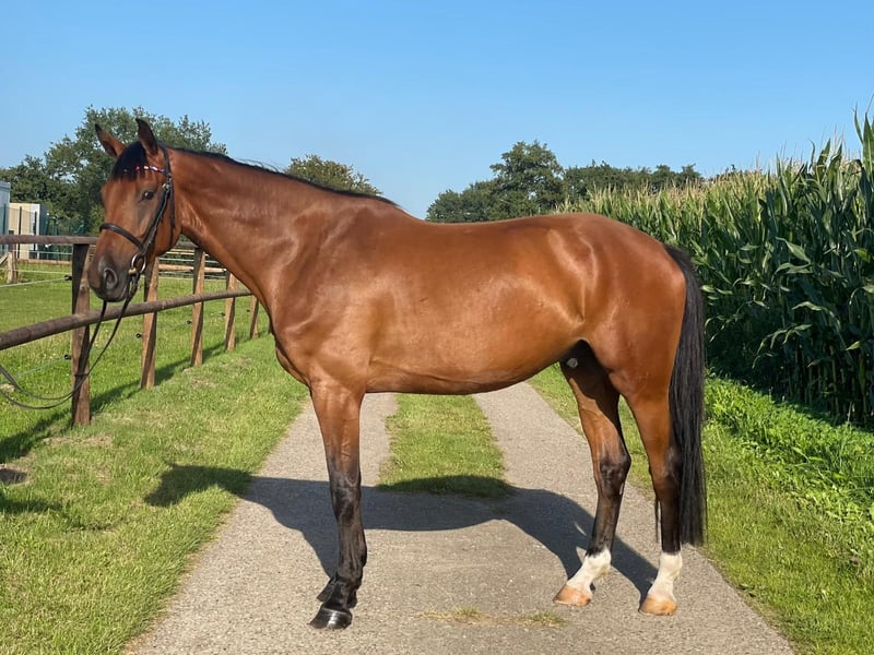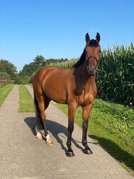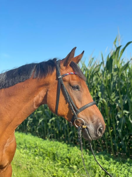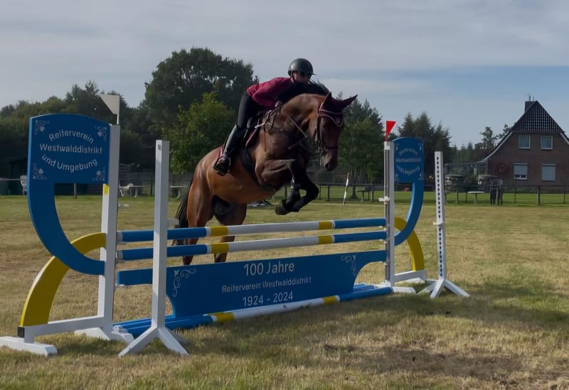 Zum Verkauf steht „Coda C“, ein 4 jähriger Holsteiner Wallach von Corfu de la Vie x Cascavelle x Landgraf. Er ist aktuell 1,68m groß, artig und gesund. Vom Kopf bis zum Fundament stimmt bei diesem Wallach alles. Codas Ausbildungsstand ist dem Alter entsprechend, er springt ohne Probleme ganze Parcours mit Kombinationen und Unterbauten, und das nicht nur zu Hause sondern auch auf fremden Plätzen. Er ist bereits seine ersten Turniere gegangen und zeigte dort keinerlei Unarten. Ausreiten gehen ist mit ihm ebenfalls kein Problem. Zudem ist er verträglich mit anderen Pferden und steht aktuell nachts in der Box und tagsüber in der Herde. Coda hatte zwei Befunde, die aber bereits entfernt wurden. Es sind Videos von Trainingsrunden und vom Turnier vorhanden. Für weitere Fragen stehe ich gerne zur Verfügung