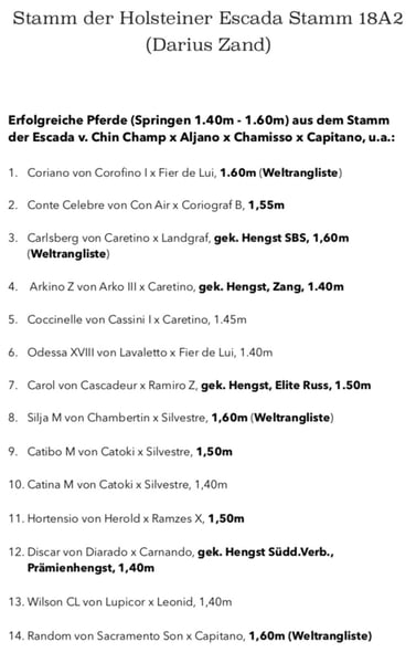Wunderschönes, bewegungsstarkes, prämiertes Holsteiner Nachwuchspferd mit viel Vermögen von Nabab de Reve aus einer Mutter von Chin Champ. Aus der direkten Mutterlinie und dem Stamm 18a2 sind zahlreiche Erfolgspferde im gehobenen Springsport. Nabab Champ ist angeritten, springt sehr gut und bewegt sich auch außergewöhnlich gut. Genetisch ist er für den Springsport prädestiniert und könnte mit knapp 50% Blutanteil auch als Vielseitigkeitspferd sehr interessant sein. Auf dem Video ist er erst das 5. Mal unter dem Reiter und zeigt seine außergewöhnliche Rittigkeit. Als einer der letzten Nachkommen vom Ausnahmehengst Nabab de Reve ist er besonders interessant. Wir züchten mit Stuten bester Genetik in Anpaarung mit sporterfolgreichen Hengsten, wie Baloubet du Rouet, Casall, Clarimo, Cornet Obolensky, Diamant de Semilly, Dominator 2000 Z, Dourkhan Hero Z, Eldorado van de Zeshoek, Kannan, Nabab de Reve, Quidam de Revel und Taloubet Z und haben daraus Nachwuchspferde, von Fohlen bis zu erfolgreichen Sportpferden. Bei Interesse melden Sie sich gerne +49.173.3074429 oder info@zanddynasty.com.