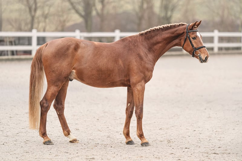 Lenon, un semental Holsteiner de casi 4 años, hijo de Livelo x Con Cosmos. Lenon es un castaño elegante con crin y cola rubias. A pesar de su apariencia, es un excelente mover y un saltador muy talentoso. Lenon tiene sangre y muestra una gran calidad en el salto. Comenzó su entrenamiento bajo la silla el otoño pasado. Lenon es fácil de manejar y no tiene vicios.