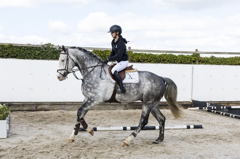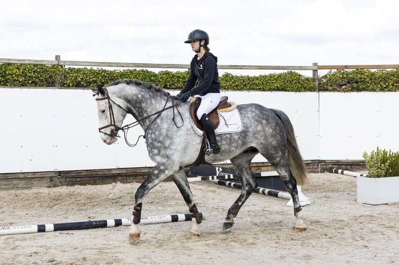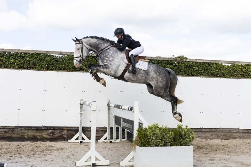 Beautiful grey type with a comfortable way of moving. Careful on the jump with a good attitude and willingness. Nice character and pleasant in handling. Easy to ride and gives a confident feeling. Recently under saddle for 2 months. Suitable as an amateur horse. Sire Diaron OLD – 1.50m level. Son of Diamant de Semilly (1.60m) and successful at international level. Dam Caba-Rouge PS – daughter of Cabachon (1.60m). Damline Granddam Cartograna Rouge – daughter of Cartogran (1.40m). From this line: Kyoto du Gibet – 1.45m Chakpori du Gibet – 1.55m Further in the line: Carlon 10 – 1.40m Made in Rouge – 1.50m Chaccolan – 1.60m Strong sport line with multiple horses at 1.40m–1.60m level.
