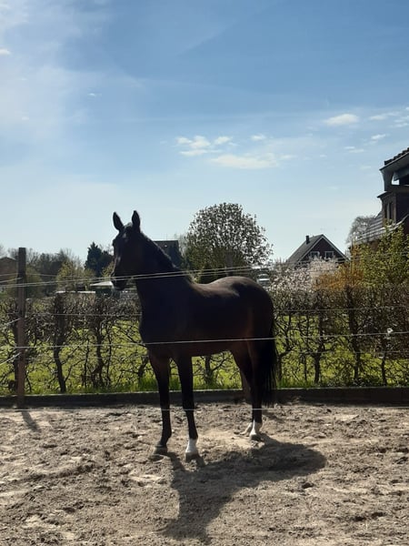 Je propose à la vente mon joli hongre Holstein de 7 ans, Bilbunya, de couleur baie foncée. Il est très intelligent, curieux, joueur et proche de l’homme. Sa passion va au travail à la longe, au travail en liberté, à l’agilité et au clicker training. Il est monté, mais en raison d’une blessure aux tendons guérie, il n’est pas adapté à un sport équestre intensif, étant donné qu’il a été au box pendant un an de poulain. Il recherche un partenaire qui souhaite s’occuper de lui de manière variée et polyvalente. Il aime son humain et essaie toujours de lui faire plaisir. Il est bien entendu vacciné, déparasité et présenté régulièrement chez le maréchal-ferrant. Actuellement, il vit en paddock, mais il s’adapte également bien à une vie en box avec beaucoup de paddock à disposition. En raison de sa blessure aux tendons, qui l’a contraint à une longue période de repos en box en tant que poulain, il a malheureusement commencé à faire du copitage. Il ne coppe actuellement que lorsqu’il cherche de l’attention ou après avoir reçu des granulés ou des friandises.