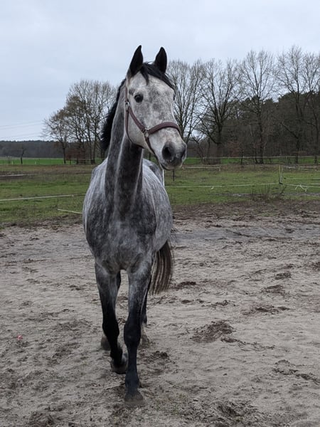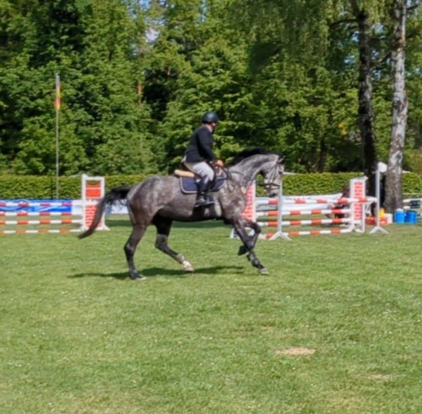 Verkaufen 7 jährigen Schimmelwallach. Beim Reiten und im Umgang ist er absolut artig. Er ist dressurmäßig gut zu reiten, springt einen A Parcours (war 2024 auch schon Gewöhnungsspringen platziert) und geht artig ins Gelände. Alleine ist er dort manchmal etwas ängstlich, aber kein Steigen oder buckeln. Claus steht in einer gemischten Gruppe und ist hier eher rangniedrig. Er hat von Geburt an einen blauen Fleck im Auge, der sich aber nicht vergrößert (siehe Bild ). Seine Sicht nach hinten ist eingeschränkt, nach vorne uneingeschränkt. Hiermit hat er aber keinerlei Probleme.