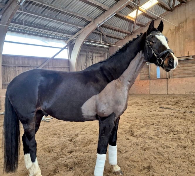 Pedigree: Sire: For Romance I (by Fürst Romancier – MV: Sir Donnerhall I) Dam: Carpaccio Brief Information: Breed: Holsteiner Sex: Gelding Date of Birth: May 28, 2018 Notably, he features a beautiful special coat with a large blaze and four white legs. Training: The gelding has been gently and age-appropriately ridden and exercised by a young girl, making him completely unspoiled at this stage. Further training or targeted sport-specific development has not yet taken place due to time constraints; however, he is currently in a professional riding stable where he is being ridden and further trained in sport. Already, he shows great potential for advanced training. For future work and further development, he is not suitable for beginners. He always behaves friendly and uncomplicated in handling. A handsome, young gelding with a distinctive appearance and a bright future ahead.