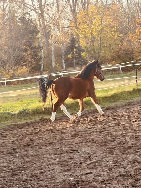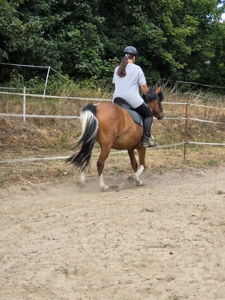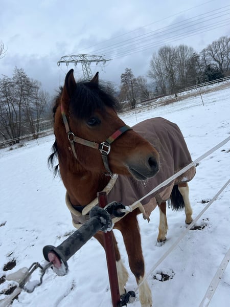 With a heavy heart, I must part with my pony gelding Sultan. He is 6 years old and approximately 1.42 meters tall. He is a Huzule and classified as a pinto. Sultan is a little macho and requires a consistent but loving hand. He is sweet when riding and is trained in all three gaits. He also performs quite well when jumping. Grooming is not a problem. He knows the farrier but does not stand completely still. In the pasture with other horses, he is quite dominant and needs a horse partner who can set boundaries for him. Sultan needs time to build trust. Sultan is not an easy pony. He is not suitable for beginners or as a children's pony. He will only be sold to experienced riders. If interested, a meeting and trial ride are welcome.