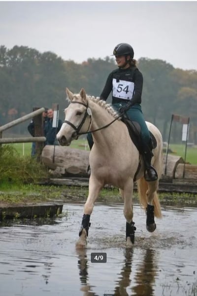 Getalenteerde, koele 3j merrie (2022) met ISH stamboek, volledig RX goedgekeurd zonder bemerkingen. Wij hebben haar sinds veulen en dus is haar hele geschiedenis gekend. Dunguaire Lola is zadelmak gemaakt begin augustus, heeft haar eerste crosservaringen achter de rug en toont hiervoor zeer veel potentie. Ze heeft een krachtige sprong, beweegt mooi en heeft een dapper karakter. 👌 voor de eventing! Heeft ook reeds 1 jumpingwedstrijd gelopen op 70 en 80 cm! Ze is dus helemaal klaar om na haar verdiende break weer rustig in het werk te gaan. Ze is op verplaatsing heel chill. Lola is een zeer lief paard, rustig in omgang en zeer verstandig. Heeft bij het zadelmak maken geen stap verkeerd gezet en ook tot nu verteert ze alle nieuwe indrukken supergoed. Lola is op een rustige manier beleerd, geen zweep, geen sporen, waardoor ze het werk ook gewoon leuk vindt. Ze loopt op haar eigen benen en heeft al veel balans om toch nog maar 3j te zijn. Dus ben je op zoek nr je volgende eventingtalentje , in een mooi jasje, kom ze gerust even testen! Ze kan gerust ook dienen voor iemand die van de pony's komt omdat ze zo braaf is. Lola staat in Nederhasselt (Ninove) en kan na afspraak getest worden. Wij zien Lola graag vertrekken nr een ambitieus iemand met een hart voor en kennis van paarden. Na haar derde eventing in Meldert op 02/11, staat Lola op een weide en wordt ze niet meer gewerkt. Wij vinden dat ze haar rust meer dan verdiend heeft. Lolai is momenteel 1m57, maar zal naar verwachting de 1m60 aantikken als ze volgroeid is. Amazonde op de foto is 1m71.