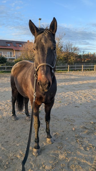 People-oriented, intelligent gelding seeking a permanent home Diamond is an 11-year-old Irish Sport Horse gelding, standing approximately 16.1 hh. He is very affectionate towards people and enjoys interaction and attention. He feels most comfortable and has the most fun in the outdoor environment. An excellent adventure buddy! He is well-behaved under saddle on the arena, though riding there is not his favorite activity. He enjoys groundwork and makes an effort to respond to commands. His playful personality makes him a joy to be around—a real charmer. He is best suited for one or two riders; he does not get along well with changing handlers or riders. He requires turnout in a pasture with a herd. Keeping him stabled, even with turnout, tends to make him anxious and easily spooked. In a harmonious herd environment, these issues are not noticeable. Currently, he is shod with oil-lathed shoes on all four feet. I have also previously kept him barefoot at the back. However, due to the hard surfaces in the turnout, he quickly wears down his hooves and becomes tender-footed. He has developed equine asthma and shows two minor arthritic changes, which do not limit him. The asthma is currently moderate. With an appropriate stable environment, it should be manageable, and he will likely become symptom-free. I am offering him for sale because I cannot find a suitable stable nearby that can accommodate his asthma, as he tends to start coughing and produce some mucus periodically. He is vaccinated against tetanus and regularly dewormed. Further detailed information is available by phone. We also welcome a personal visit. I have grown very fond of him and wish for him to find a home where he can settle in and fully express his wonderful personality. Not a rescue sale; no riding schools or dealers. Accessories: Inhaler, rain, fly, and cooling sheets, halter, bridle, bitless bridle, etc., can be purchased with him.