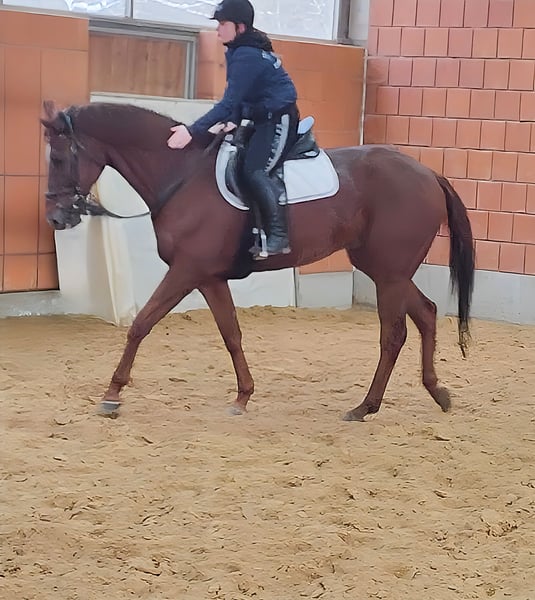Beautiful approximately 12-year-old dark chestnut gelding, around 172 cm tall, with a neck that more closely resembles that of a stallion than a gelding. Very easy to handle and establish in the stable. A horse that can be ridden effortlessly with a soft hand. Very comfortable to sit on (like a sofa). At 12 years old, in the prime of life. A real eye-catcher that not everyone in the stable has. Price takes precedence here, so he is offered at a very affordable price. If desired, he can be sold with a complete set of new accessories for a small additional fee. Transport can be arranged. A veterinary pre-purchase exam, including X-rays and blood tests, can be performed by your own veterinarian if desired. We look forward to your call at 01774289729. Written inquiries will not be answered. Calls from blocked numbers will be automatically rejected.