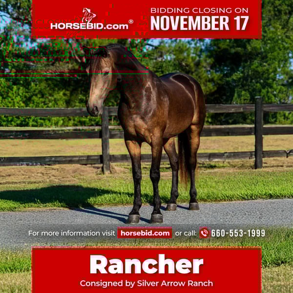 🎲𝓽𝓱𝓮 𝐑𝐈𝐃𝐄𝐑'𝐒 𝓒𝓱𝓸𝓲𝓬𝓮🎲 Happening now thru MONDAY | NOVEMBER 17th - Available EXCLUSIVELY on HorseBid's website! For more details and to register visit: www.Horsebid.com CONSIGNOR CONTACT: Silver Arrow Ranch 660-553-1999 LOCATION: Ocala fl BREED: Irish sport horse cross REGISTERED: No COLOR: Buckskin HEIGHT: 15 AGE: 4 GENDER: Gelding Rancher - a stunning 4-year-old gelding standing at 15 hands, perfect for riders looking to enjoy both English and Western disciplines. Rancher excels in trail riding and working on the flat, showcasing his versatility and eagerness to take on new challenges. He has confidently navigated various trails, making him a reliable companion for outdoor adventures. With a solid foundation in basic dressage, Rancher is quick to respond to cues, providing a responsive ride in the arena. Additionally, he has experience in cross-country, demonstrating his capability and spirit for diverse terrains. Rancher is sensible yet sensitive, making him an ideal horse for riders who appreciate a partner that understands their cues and promotes a great learning experience. Don't miss out on the opportunity to make this incredible gelding a part of your equestrian journey. Contact us for more information or to schedule a visit to meet Rancher!