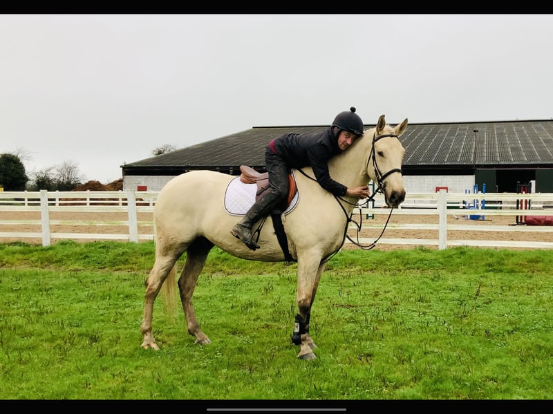 2020 Palomino Gelding, 16.1 hh There are horses you simply meet — and then there are horses like Ken, who steal your heart from the very first moment. With his shimmering Palomino coat that gleams in the sun and his gentle, intelligent gaze, Ken is what you might call a true “dream horse” — beautiful, friendly, and completely honest. Ken is not just a horse; he is a true friend. He is always the first to greet you in the pasture, with alert ears and a soft look, always ready for a hug or some cuddles. He loves attention, is incredibly people-oriented, and has a loving, loyal nature. No matter how your day has been — Ken welcomes you with joy and makes everything better. Under saddle, Ken is as straightforward and reliable as one could wish. Calm, well-behaved, and fearless — he remains consistent whether at home or in a new environment. He is equally comfortable riding alone or in company, is completely traffic-safe, and takes everything in stride. His balanced temperament makes him an ideal partner for riders of all experience levels, and his honest, gentle character always inspires trust. But Ken is not only a sweetheart to handle; he is also a talented, athletic young horse with great potential. He moves elegantly and balanced, with three expressive gaits and a soft, refined contact. He has been worked over jumps and cross-country, confidently jumping water, ditches, coffins, and banks. Brave, clever, and always eager to please his rider — Ken gives his best every time. Whether as a versatile all-rounder, leisure partner, hunt horse, or riding club horse — he is ready for any adventure and anyone seeking a true heart horse. He is well-behaved for the farrier, loading, catching, grooming, and riding, and is absolutely traffic-safe. Ken has no stable vices and can be examined by a veterinarian. Everything about him is straightforward — he always wants to do right by his human. The price includes delivery to the UK, and if you are not completely satisfied, an exchange is possible — although we are confident you will fall in love with him at first sight. For more information or to learn more about this very special gelding, please call 00353 86 807 7626 or email gertytynan@gmail.com. Watch his video and see for yourself — Ken is a fairy-tale horse: golden on the outside, pure gold inside.