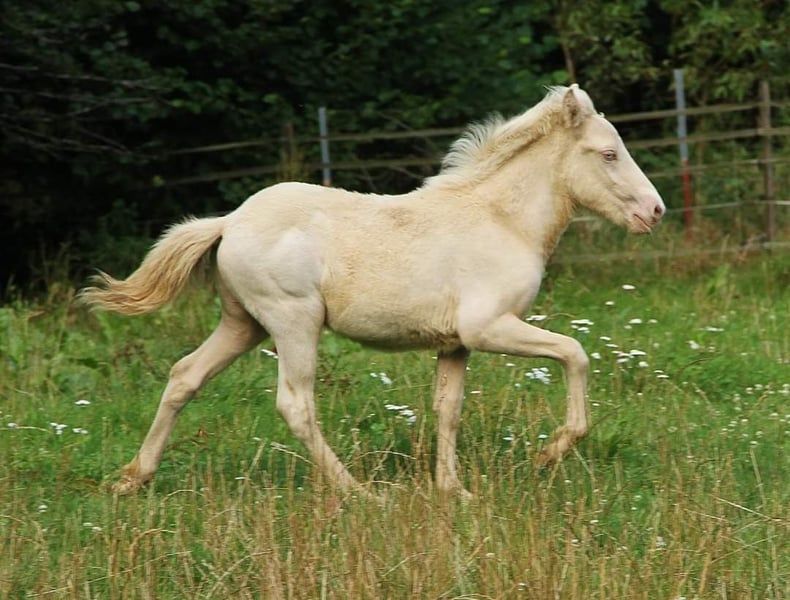 Fagurfifill ein heranwachsendes Traumpferd in Weiß mit blauen Augen - like a Unicorn Für kurze Zeit noch wegen Reduktion zum Fohlenpreis zu haben bei zeitnaher Abholung und Bezahlung noch im Januar. Kein Tausch. Er ist weiß geboren da er Doppelcreme = reinerbig Creme ist. Getestet wurde er als Perlino AaEe zusätzlich ist er mischerbig Schimmel N/G. Da er selbst schon weiß geboren ist hat das Schimmelgen auf seine eigene Farbe keine sichtbare Auswirkung. Fagurfifill überzeugt vom Tag seiner Geburt an mit seinem unkomplizierten freundlichen und vertrauensvollen Charakter. Er ist immer sofort bei einem, sucht den Menschenkontakt und ist auch an allem Interessiert was um ihn herum passiert. Vom Temperament zeigt er sich bis dato sehr ausgeglichen mit guter Lauffreude und stehts klarem Kopf. Durch seine Haltung kennt er viele Umwelteinflüsse und begegnet diesen jetzt schon relativ gelassen. Er wächst bis dato artgerecht und gut sozialisiert in einer altersgemischten Jungstruppe auf. Wird regelmäßig entwurmt, ist geimpft gegen Tetanus und Influenca, Ekzemfrei aus ekzemfreien Eltern, regelmäßig Hufe gepflegt- Hufpflegefromm, kennt die tägliche Gabe von Zusatzfutter mit Mineralfutter. Durch Weideumtrieb mit Pferdeanhänger von Fohlen an das Verladen und gefahren werden im positiven gewöhnt dadurch Verladefromm. Er ist mit seinen derzeit 1,5 Jahren gut Entwickelt und von Geburt an mit stabilem Fundament ausgestattet, natürlich jetzt als Jungpferd auch oft im Gebäude wachstumsbedingt nicht immer schön anzusehen, aber anhand seiner Eltern sollte er später mit harmonischem sportlich stabilem Gebäude und Endmaß um die 140 glänzen. Zudem hat er von seiner Mutter die mega Mähne geerbt, welche immer länger wird. Fagurfifill ist Fünfgangveranlagt mit ausgeprägten guten Grundgängen. Sein Schritt sauber vorhanden, die ersten Wochen nach Geburt hat er fast ausschließlich Tölt gezeigt und zeitweilig auch Pass. Seitdem er den Trab gefunden hat zeigt er diesen sicher, raumgreifend mit viel Schub und Tempofähigkeit. Je nach Tagesform ist der Tölt immer wieder mindestens in den Übergängen und mehr sichtbar. Sein Galopp ist für einen Fünfgänger gut ausgeprägt mit oft Bergauftendenz versehen. Ganglich bringt er viel Potential und wäre nicht nur ein zukünftiges gehobenes Freizeitpferd sondern bietet auch die Option auf Sport. Seine gute Abstammung ergänzt seine perfekte Mischung aus bestem Charakter und Gangvermögen. Es finden sich bei ihm hoch geprüfte Pferde wie der Álfur frá Selfossi Sohn Þórálfur frá Prestsbæ. Den Krákur frá Blesastöðum 1A Sohn Þorlákur frá Prestsbæ und Skjanni fra Nyjabae Sohn des Hróður frá Refsstöðum. Wie auch den bekannten Klettur frá Hvammi. Sein Stammbaum ist bis einschließlich den Urgroßeltern vollständig DNA bestätigt, erst dannach gibt es DNA-Lücken da nicht von allen Pferden DNA vorliegt. Fagurfifill kann auf Wunsch gegen Kostenerstattung noch bei mir Kastriert werden und nach Abheilung dann erst ins neue Zuhause umziehen. Beide Hoden sind abgestiegen vorhanden. Aktuell ist er recht plüschig, er kann gerne persönlich kennengelernt werden. Die Fotos sind von Fohlen bis Winteranfang 25. Es gibt lediglich nur das Fohlenvideo, weitere Videos sind derzeit organisatorisch und Platztechnisch nicht machbar. Bei echtem Interesse freue ich mich auf Nachricht. Ab 01.02.2026 wird er für 4800 € abgegeben, Preis mit weiterer Aufzucht steigend, um die bis dato angefallenen Kosten der Zucht/Aufzucht wenigstens decken zu können.