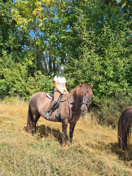 We are offering our beautiful Icelandic mare for sale and are looking for an experienced and suitable home for her. Gandála has been reliably used in a riding school for many years. Currently, she lives with us in a pair, where she can be quite dominant. She also requires clear and consistent leadership when handling her—then she proves to be a friendly and pleasant leisure horse. For our 11-year-old daughter and our other mare, however, she is too strong and willful, which is why we have made the difficult decision to find a environment that better suits her needs. About Gandála: • 11 years old • Grey dun, approximately 14.1 hh • Fully healthy, no eczema, allergies, or other issues • Complete papers • Regular veterinary and osteopathic care and maintenance • Barefoot • Trained and ridden in 3-gait, tölt is present • People-oriented and friendly, but needs clear guidance and an experienced rider • Dominant, therefore better suited to a larger group or a stable hierarchy • She loves the outdoors – long rides in all gaits are exactly her thing. In the arena or hall, she tends to be more lively and less motivated. We wish for Gandála to find a home where she can enjoy lots of outdoor riding, receive clear structure, and live in a herd that suits her temperament. Location: Near Wittlich