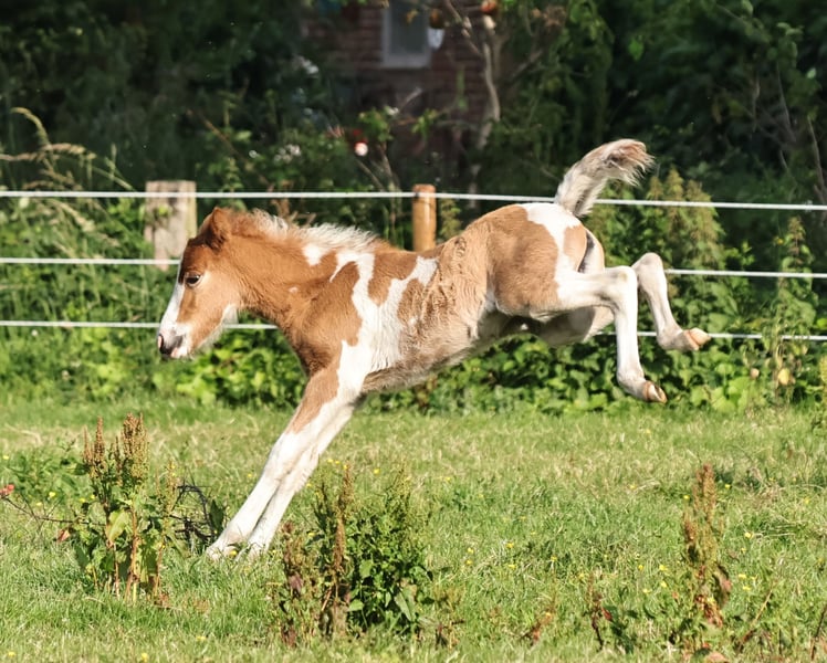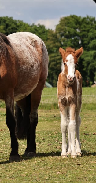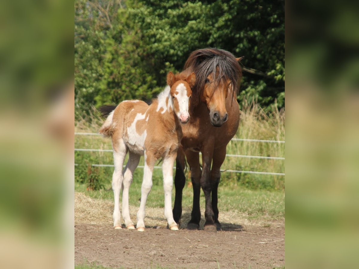 Handsome Aska vom Röttgershof is looking for a loving home! - a beautiful mare born on 17.05.2025 - her color is chestnut pinto, possibly with the roan gene. I'm also completely in love with her beautifully marked blaze! - 5-gaited, she already shows a nice separation of tölt and trot. - sweet character, loves to cuddle but is not pushy. - mother: Meyla von der Haard, a fantastic, well-behaved pony that I ride with much love. - father: Skuggi frá Skeggstödum, a nice character with fantastic gaits! He has just returned home from being backed by Marieke Weber. - both mother and father can be admired at our place. Feel free to send a message for more info, videos, or photos!