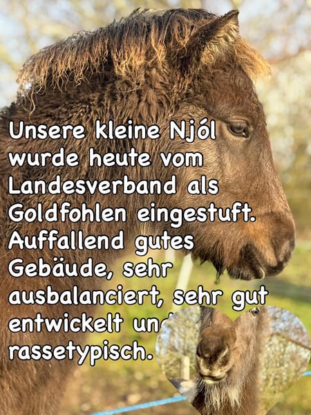 Njóla vom Birkenberg, ein außergewöhnlich schönes, mutiges, ausbalanciertes Stutfohlen mit klar getrennten Gängen, in der seltenen Farbe Rappisabellschecke. Vom Zuchtverband mit 8/8,5/8,5 bewertet, genau wie die Mutter Pálina vom Bienwald, eine große 5-Gangstute mit extrem gutem Gebäude, sehr gutem Tölt und Galopp, sowie viel Pass und gutem Trab und Schritt (Noten bis 7 auf Turnier). Der Vater ist 100% Crem Vererber, 50% Schecke, groß und kräftig. IGV Deutscher Meister mit klarer Gangtrennung. Njóla ist sehr entspannt im Umgang, gibt Hufe und lässt sich aufhalten. Sie ist im Herdenverband aufgewachsen, regelmäßig entwurmt und einfach nur „Zucker“. Sie kann gerne zur Aufzucht bleiben und wird nur in die passenden Hände verkauft. Gangpferde Birkenhof 0151-67580759