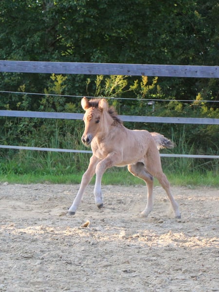 Eydís von Páskadagur *2025 Braunfalbe Eydís ist eine bildschöne, große Absetzerstute. Sie ist 5gängig veranlagt und zeigt seit Tag 1 viel sprudelnden Tölt. Eydís ist ein selbstbewusstes, unerschrockenes Stutfohlen, die mit Präsenz und Austrahlung glänzt. Dem Menschen stets zugewandt. Ihre Mutter Elfa vom Lubberland ist eine Hilmir frá Sauðárkróki Tochter. Sie ist sehr groß und fünfgängig veranlagt. Sie hat ein angenehmes Vorwärts, 5 gleichmäßig verteilten Gänge und unglaublich viel Ausdruck. Elfa ist absolut kopfklar, zuverlässig und unglaublich bequem. Ein Pferd das einfach Spaß macht. Ihr Vater Brilljant frá Efri-Fitjum ist ein gangstarker Junghengst. Er hat spektakuläre Gänge, einen höflichen Charakter, sowie bemerkenswerte Bewegungen. Mit seiner sehr ansprechenden Abstammung, ein Hengst von den man noch hören wird. Eydís ist regelmäßig entwurmt, geimpft, gut mineralisiert, kennt Putzen und das Halfter. Aufzuchtsplatz in der Nähe kann vermittelt werden. Sie kann sofort ausziehen.