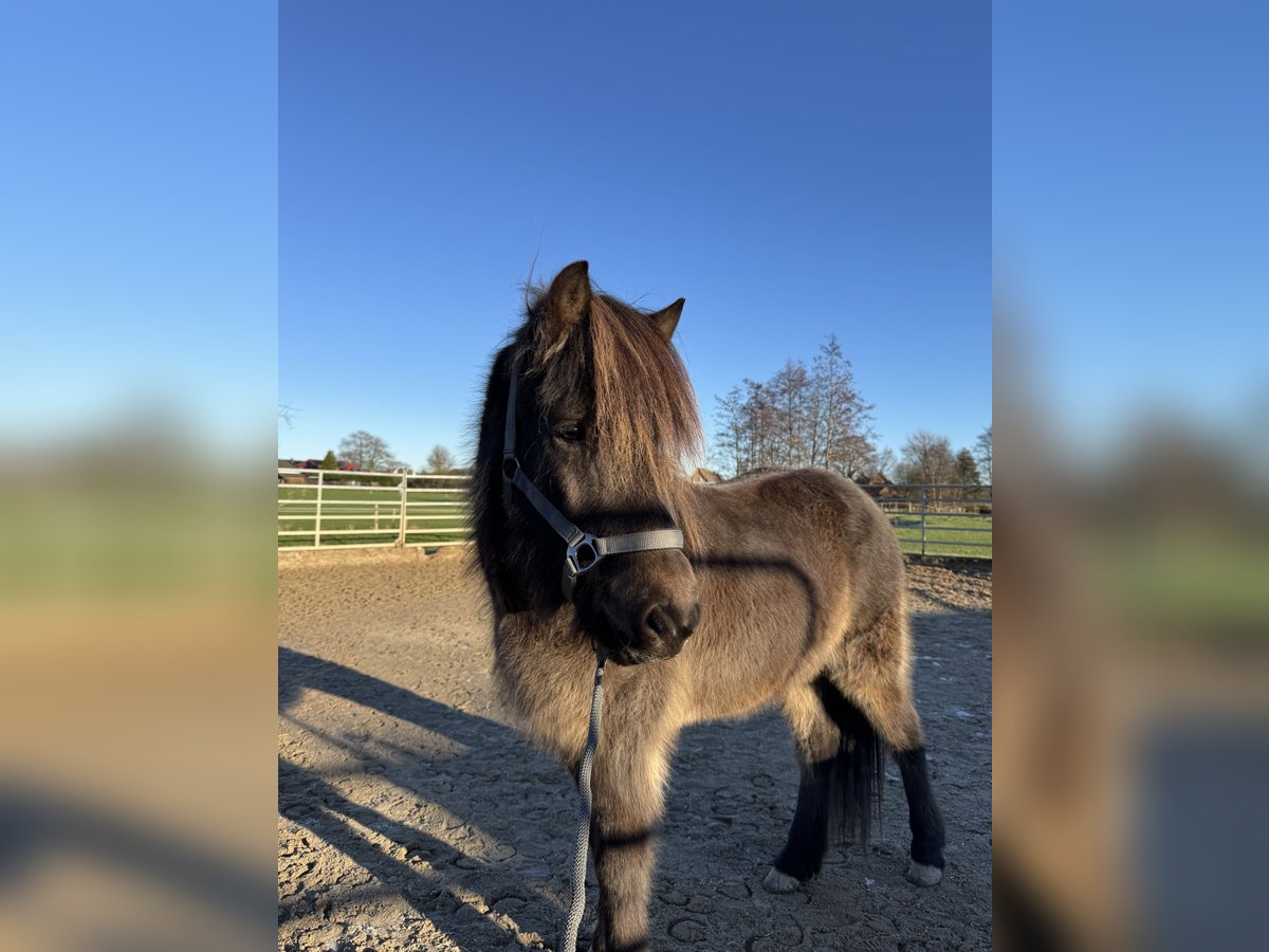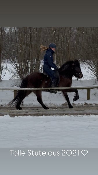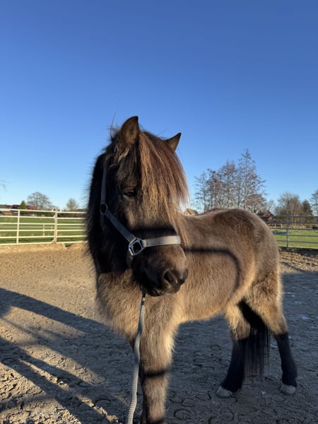Kringla ist eine 2021 geborene Islandstute in der besonderen Farbe Dunkelerdfarben. Sie wird derzeit bei uns im Rahmen des IPZV Jungpferdebereiters ausgebildet und zeigt sich gelehrig und motiviert. Sie kennt die Arbeit in der Halle, auf der Ovalbahn und im Gelände. Sie geht als Handpferd und an der Doppellonge. Kringla ist mutig und unerschrocken. Nach der dreimonatigen Grundausbildung muss sie weiter ausgebildet werden, wird aber sicher ein tolles Familienpferd. Sie ist das letzte Jahr bei uns aufgewachsen und war immer gesund. Sie hat kein Ekzem.
