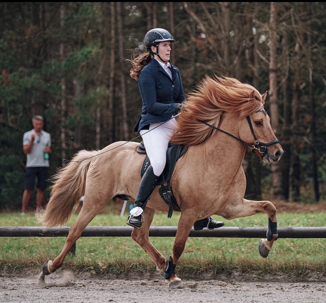 Super elegancki wszechstronny koń z ogromnym potencjałem na wysokie zawody Máni frá Hrafnkelsstödum IS2012136873 Máni to niezwykle elegancki, 1,42 m wysoki wspaniały potomek rasy Galsi, pięciobiegowiec w efektowym, specjalnym kolorze: ogier rudy z gwiazdą na czole. Do końca 2024 roku był ogierem, ma na swoim koncie 20 wspaniałych potomków, w tym kilka elitarnych źrebiąt. Máni to absolutny wszechstronny koń, jak z obrazka: - skacze ponad 1,30 m - Futurity czterobieg (5-letni): 6,9 punktu - FIZO we wszystkich chodach 8,0 (przedstawiany jako czterobiegowiec) - uwielbia galopować na lonży przez las - zawsze jest posłuszny i reaguje na pomoce (nie jest to koń dla początkujących!) Máni bez problemu porusza się zarówno w terenie z przodu, jak i z tyłu. Zna wszystkie podstawowe ćwiczenia ujeżdżeniowe i jest bardzo lekko reagujący na pomoce. Z powodu mojej ciąży niestety stałem się dla niego zbyt ciężki, a ostatecznie był dla mnie trochę za mały (mam około 1,90 m wzrostu). Mogę sobie wyobrazić Máni jako świetnego partnera dla dobrze jeżdżącego młodzieńca lub juniora, który chce zdobywać nagrody na zawodach lub planuje udział w DJIM. Jego najwyższa ocena to 7,0 w Tölt, Galopie i Trakcie, oraz 6,5 w Kłusie. Był już kwalifikowany do F1, jednak czasami jego chód pasowy jest nieco czterotaktowy, dlatego widzę jego potencjał bardziej w V1 i T1. Jako luksusowa końcówka rekreacyjna również byłby idealny. Máni ma dobre usposobienie, jest zawsze pracowity i uwielbia być aktywny i pracować. Máni jest regularnie (na zawody) odrobaczany, szczepiony, pokazywany u kowala, osteopaty i stomatologa. Obecnie jest nieaktywny treningowo, ponieważ byłam w ciąży. Po rozpoczęciu treningów cena wzrośnie. Lokalizacja: 49832 Thuine