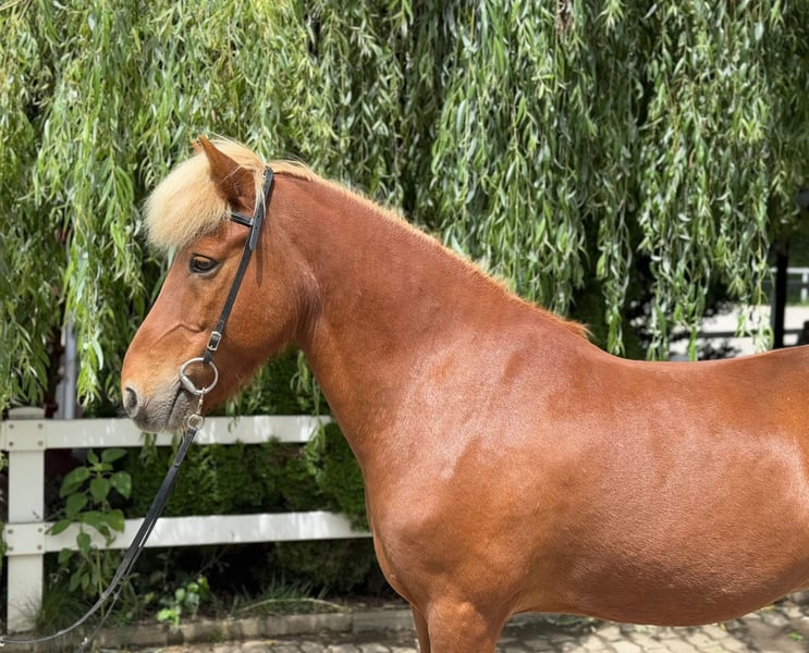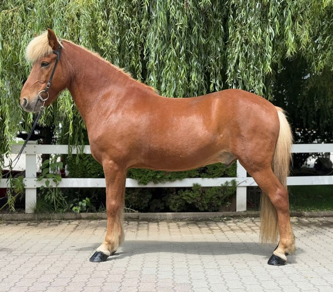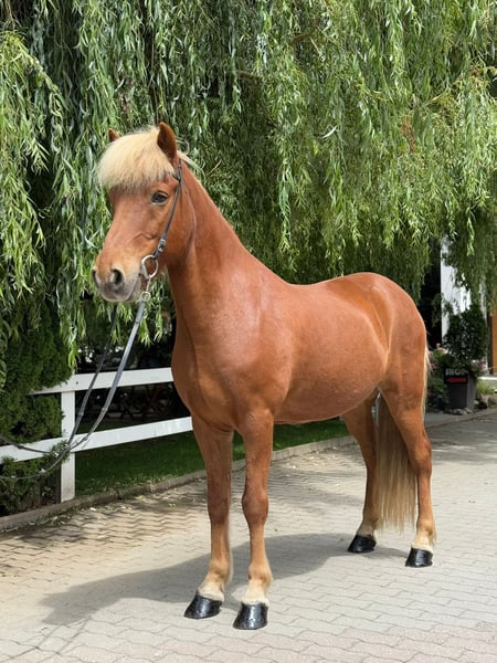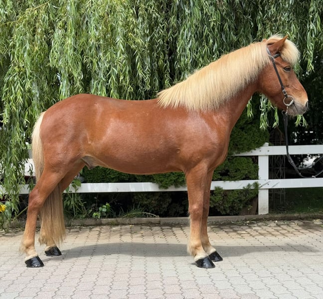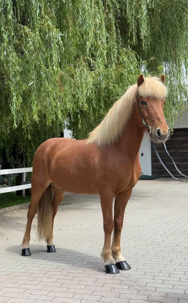 Adam frá Árdal Gelding, *2012 in Iceland Free of eczema Four-gaited Chestnut with a light mane Shoed, dewormed, and vaccinated Sire: Klettur frá Hvammi 8.49 (Ext 8.43 Re 8.54) ‼️ Dam's Sire: Gustur frá Hóli 8.57 (Ext 8.13 Re 9.01) ‼️ Dam: Ársol frá Mið-Fossum 8.12 (Ext 8.00 Re 8.20) Dam's Dam's Sire: Svartur frá Unalæk 8.54 (Ext 8.18 Re 8.90) ‼️ Adam is a robustly built gelding. He impresses not only with his athletic stature and shiny coat but also with his clear mind and friendly nature. Whether in the arena, on the oval track, in the dressage ring, or out on the trail – he always presents himself as fearless, strong-minded, and calm. A true "rock in the surf" that you can rely on at any time. His consistently elite-tested ancestors represent quality and rideability. With his clearly separated, easily accessible four gaits, he brings joy to both beginners and experienced riders. His walk is smooth and provides a secure riding feeling from the very beginning. Especially his comfortable tölt invites leisurely rides in the countryside. What more could one wish for?! In handling, he is kind, calm, and people-oriented: He stands patiently at the tie and enjoys extensive grooming sessions. In the herd, he is social and compatible. A perfect leisure partner for the whole family, just get on, feel comfortable, and enjoy. If you would like to be enchanted by Adam yourself, you are welcome to meet and try him out with us in A-5221 Lochen am See by appointment.