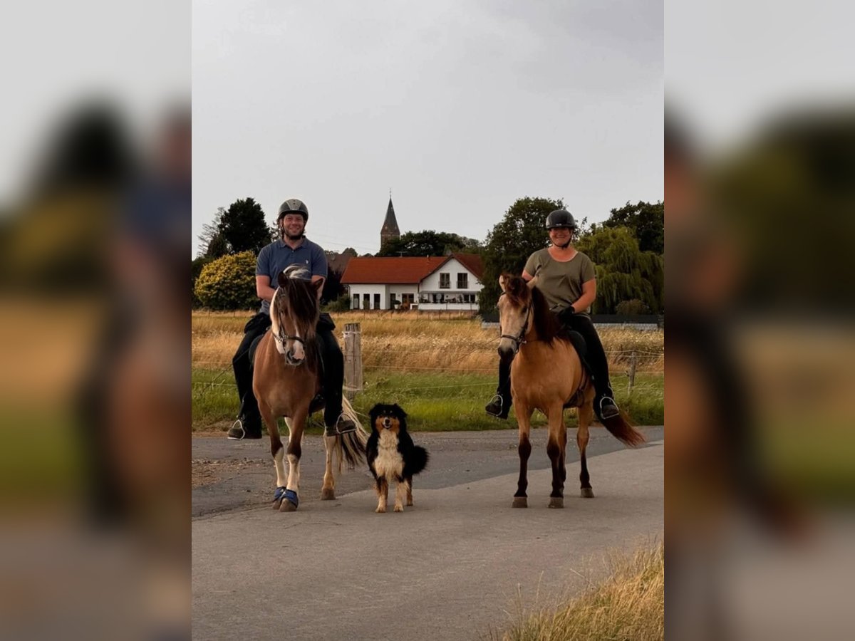 Angi von Blomatùn- seltene Gelegenheit & echtes Juwel. Angi hat das Wort "Verlasspferd" erfunden. Mit seinen 6 Jahren bringt ihn wirklich Nichts aus der Ruhe: Alleine ins Gelände mit 3 wild durcheinander laufenden Junghunden im Dunkeln- vorbei am Zug- kein Thema! In einer großen Gruppe über Stock und Stein, durch den Wald, vorbei am Schießstand und im Galopp mit einem halben Kilometer Abstand zu den anderen Pferden - für dieses Pferd ein Witz! Weihnachtskranz um den Hals, Turnübungen auf seinem Rücken- wo andere schon weg sind, steht Angi in erster Reihe und schmunzelt charmant. Neben seiner Nervenstärke ist er vom Gemüt auch Typ gemütlich- der Reiter kann definitiv mehr Treiben wie Bremsen, im Gelände läuft er angenehm fröhlich, in der Bahn eher sparsam- ideales Kinder-Anfänger-Angstreiter-Pferd oder für Jeden, der ein nervenstarkes Pferd mit weniger Vorwärts toll findet! Angi läuft Schritt, Trab und Schaukelgalopp und zeigt auch (altersbedingt) erste Ansätze im Tölt- dieser kann weiter ausgebaut werden. Nach so einem Diamant werden wir so oft gefragt - also nicht zögern und vorbeikommen! Er wurde passend geimpft, Zähne sind gemacht und die Hufe sind ebenfalls regelmäßig gemacht: Checkheftgepflegt :) Ein Video ist vorhanden: Dazu bitte via WhatsApp anfragen: 015751605833