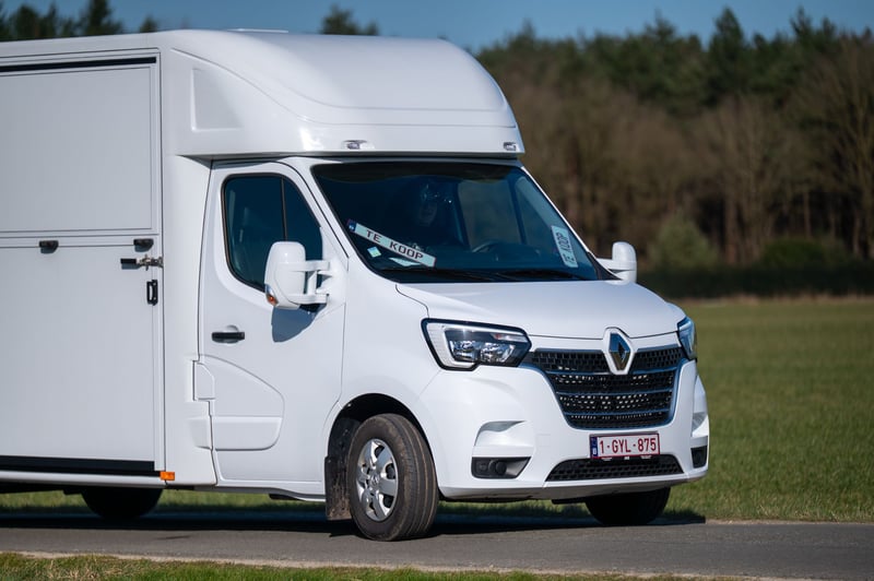 https://esha.horse/Auctions/Item/5667 Nueva camioneta ultra ligera para 2 caballos Renault Master adecuada para licencia de conducir B con una carga útil de 1100 kg. Modelo: Renault Grand Master Confort (L3), en blanco mineral, interior en acabado en carbón oscuro, tapicería de tela ‘Kaleido’, parrilla del radiador en acabado cromado, aire acondicionado, radio DAB, asiento del conductor con reposabrazos y soporte lumbar ajustable. Construcción en estilo semental, tabique deslizante, puertas divisorias plegables, paragolpes, cámara de marcha atrás y cámara en la zona de carga, iluminación LED en la zona de carga en azul/blanco, 2 claraboyas en el techo, ventilador en el techo controlable desde la cabina con monitoreo de temperatura, suelo antideslizante con desagüe, ventanas de diseño con doble acristalamiento y barrotes, enganche de remolque de 2500 kg con conector de 13 polos, escalón de acceso, spoiler en el techo con opción de paso de carga a través de la zona de carga, puerta lateral con claraboya abatible en el techo, puerta trasera, 2 soportes para sillas y 2 para bridas. Control de crucero opcional por €800 sin IVA (en lugar de €1600 sin IVA).