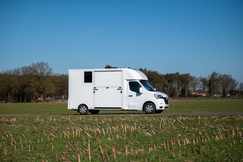 https://esha.horse/Auctions/Item/5667 New Ultra-light 2 horse Renault Master horse truck suitable for driving licence B with 1100kg payload. Model: Renault Grand Master Confort (L3), in mineral white, interior trim in dark carbon, fabric trim ‘Kaleido’, radiator grille in chrome finish, air conditioning, DAB radio, driver's seat with armrest and adjustable lumbar support. Stallion-style superstructure, sliding partition, folding partition doors, bumpers, reversing camera and camera in loading bay, LED lighting in loading bay blue/white, 2 roof hatches, roof fan operable from cabin with temperature monitoring non-slip floor with bleed, glass-in-glass design windows with bars, 2500 kg towing hook with 13-pin socket, footboard, roof spoiler with load-through option via loading bay, side door with tilting roof hatch, rear door, 2 saddle & 2 bridle holders. Cruise Control optionally possible € 800 ex. VAT (instead of € 1600 ex. VAT)