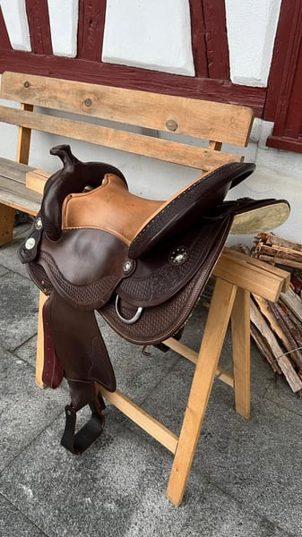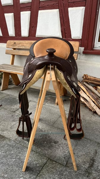 Ich verkaufe meinen wenig genutzten und gut erhaltenen Westernsattel der Marke Equiflex. Der Sattel wurde gepflegt und mit Sattelschoner geritten. Er weist daher nur leichte gebrauchspuren auf. Der Sattel wurde frisch geputzt, gefettet und das Silber poliert. Der Sattelbaum ist ein "Full Quarter Horse" Baum und der Sattel lag vorher auf einem Quarter Horse.