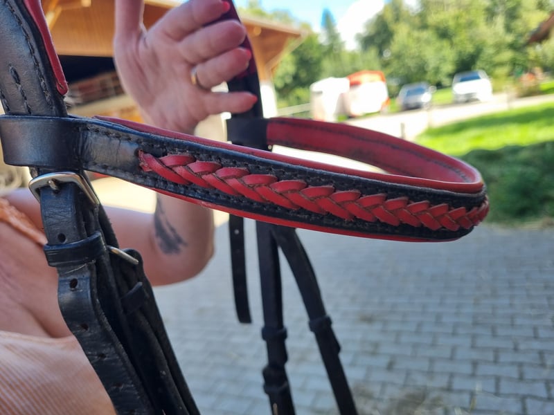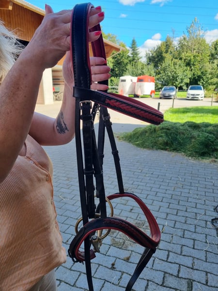 Ich verkaufe meinen von Hand angefertigten rot- schwarzen Zaum, er wurde kaum getragen
