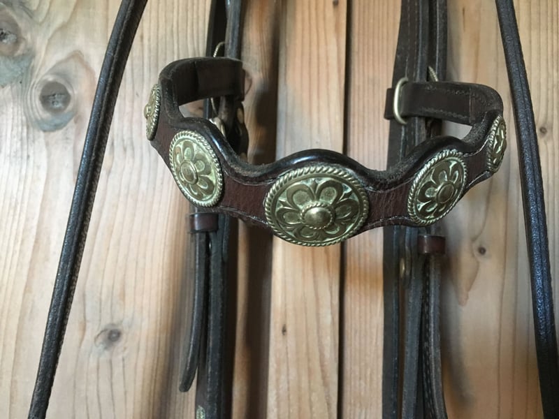 5-fach geschwungenes Stirnband, Snaffle Bit, Zügel je 225cm lang und 2cm breit, maximale Länge der Backenriemen vom Scheitel bis zum obersten Punkt der Trensenringe 56cm, 15 Conchas und Beschläge (NP Euro 566.-)