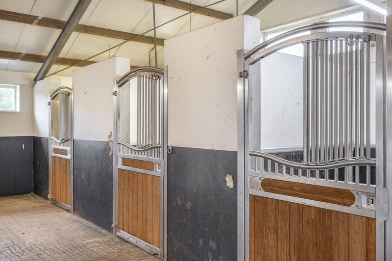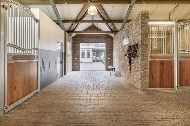 A beautiful location for horse lovers! Discover this unique property that offers plenty of opportunities for hobby and (semi)professional horse keeping at home. In addition to the spacious, lifetime-proof, detached house, there is a special outdoor favorite: a detached horse stable, finished with an eye for detail and quality. High-quality materials such as stainless steel accents and baked clinkers give the whole a unique look. The stable has six horse stalls with a functional washing area. Furthermore, the plot is equipped with a spacious outdoor arena with an ebb and flow floor and carefully landscaped paddocks – perfect for the serious horse lover! Contact us quickly for a viewing and experience for yourself the unique atmosphere and all the possibilities this property has to offer! RESIDENCE Ground floor The spacious entrance hall provides access to the living room, bedroom, toilet, and meter cupboard. The generous living room has a tiled floor, stucco walls, and a stucco ceiling. The space is divided into a sitting area and a dining area. The spacious living room has tiled floors, stucco walls, and a stucco ceiling. The space is divided into a sitting area and a dining area. The cozy sitting area, with an attractive gas fireplace, invites you to relax and enjoy cozy evenings. The dining area benefits from an abundance of natural light and a beautiful view of the horse stable. The kitchen is located in the middle. The kitchen with sink/cooking island and an appliance wall is equipped with a dishwasher, combi-oven/microwave, freezer, and refrigerator. The kitchen has plenty of storage space. The spacious bedroom with en-suite bathroom has beautiful herringbone PVC flooring, sleek stucco walls, and a stucco ceiling with recessed lighting. The generous size of the room offers you plenty of possibilities. Thanks to the built-in closets, there is ample storage space—a perfect solution for all your clothes and accessories. There is also air conditioning. The bedroom provides access to the en-suite bathroom. This attractive bathroom is fully tiled and equipped with a very spacious walk-in shower, a double sink with cabinet, and a floating toilet. The spacious walk-in shower with its sun shower and infrared function offers a true wellness experience, ideal for unwinding after a long day. In short, a wonderful space to relax. The laundry room is also accessible from the bedroom. This practical space is furnished with custom-made cabinets, including connections for washing equipment and mechanical extraction, offering an efficient and organized solution—with the added advantage that the equipment is placed at a height. A rear porch with storage and built-in cabinets provides access to the canopy and the yard. Here too, connections for washing appliances are available. First floor The landing provides access to two spacious bedrooms and a bathroom. Both bedrooms have laminate flooring, stucco walls, and a paneled ceiling. Sliding wardrobes have been created under the sloping roof, providing plenty of storage space. The bathroom is fully tiled and equipped with a walk-in shower, a sink with cabinet, and a floating toilet. A dormer window provides natural ventilation and light. A hatch provides access to the storage attic where the air conditioning unit is located. GARDEN Discover an oasis of peace and privacy: the entire house is surrounded by an outdoor area with a lawn and paving stones. The spacious covered terrace at the rear of the house is the ideal place to relax after a long day, enjoy a delicious cup of coffee, or spend quality time with family and friends. Here, you will not only experience absolute peace and privacy, but also a beautiful view that completes the rural atmosphere. HORSE STABLE Discover this beautiful, detached horse stable; a true paradise for equestrian enthusiasts. The stable is built in a traditional style with brick facades, some of which are clapboard, and is finished with a roof featuring sandwich panels in an authentic roof tile pattern. The whole is enclosed by French doors. The aisle is equipped with baked clinkers. The six horse stalls, each with a rubber floor and partly occupied and partly rubber walls. The special stainless steel revolving doors with bamboo finish and the separate outside hatch per stall contribute to the modern look and functionality. The tack room is finished with stucco walls, a wooden beam ceiling, and a concrete floor. This room is equipped with connections for washing equipment, an irrigation pump, a fuse box, and the power supply for the pasture. For extra comfort, the stable has a toilet room, which is equipped with a wall-mounted toilet, a urinal, and a sink. The washing area, with a rubber floor and walls, is equipped with hot and cold water, so your horses can always enjoy optimal care. Finally, the separate storage room, with a concrete floor, solid walls, and an insulated roof, with French doors and a wicket door, offers the perfect place to safely store supplies and materials. This horse stable combines functionality and comfort with a well-thought-out layout and quality finish – the ideal investment for serious horse lovers who appreciate attention to detail and excellent facilities. Welcome to your new equestrian paradise! OTHER FACILITIES The outdoor arena measures approximately 25 m x 50 m and has an ebb and flow floor. The pasture is divided into five paddocks. These paddocks are equipped with automatic drinking troughs. The fence is made of wood and is extra high. The yard can be closed off with an automatic gate. SPECIAL FEATURES – The entire property is connected to the sewer system, fiber optics, and gas via a propane tank. – The house is fully insulated. – The ground floor is largely equipped with underfloor heating. – The property is equipped with an alarm system connected to a monitoring station. – The stable is fully insulated. – The entire stable (including the stalls) is equipped with camera