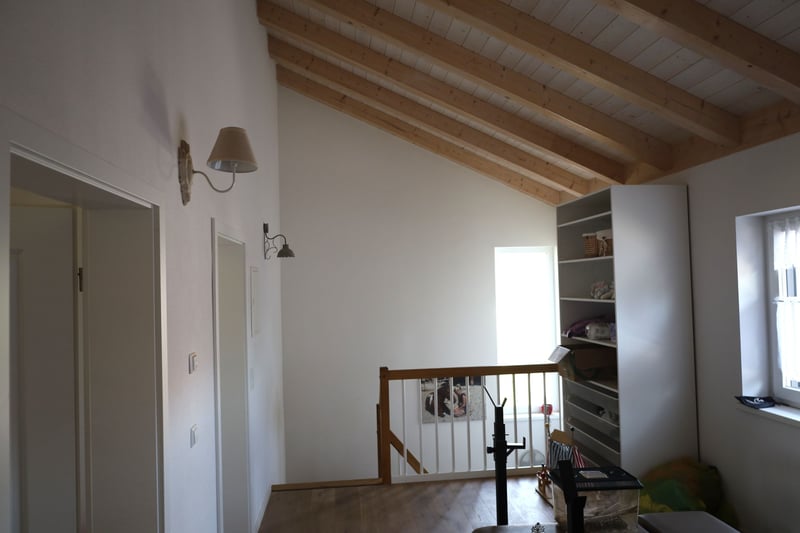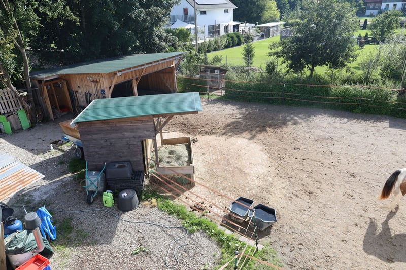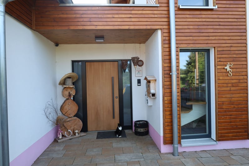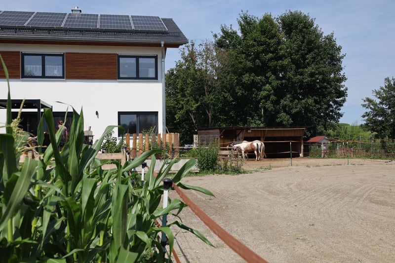 An exclusive property that is rarely found in this combination: opportunities for horse keeping directly at the house or spacious garden design on 1,786 sqm, combined with peaceful, relaxing countryside living and modern, highly efficient living in perfect infrastructural connectivity. Property Description: Built in 2021, the KfW 40+ house offers approximately 220 sqm of living space over two floors and provides ample space for families to unfold. The ground floor impresses with a solid wood ceiling, while the upper floor features an open exposed roof truss, allowing for the addition of a gallery in the upper rooms. Both floors, as well as the small granny flat, are equipped with all connections for kitchens and barrier-free bathrooms and toilets. This offers versatile usage options. All construction work was carried out by regional craftsmen, ensuring high-quality, value-stable living and a well-thought-out room layout for your dream home. A total of 10 rooms with upscale furnishings are available. A high-quality island built-in kitchen forms the heart of the bright living room, which provides direct access to the spacious terrace with a pergola. From there, you can enjoy the extensive garden or the horse facility, where you can observe your animals right outside your door. The horse facility was designed for easy dismantling, so the entire area can quickly be repurposed for other uses. A chicken area with two henhouses completes the garden to the east. Schedule your viewing appointment now and take a step closer to your dream home! Viewing requests are kindly accepted via email for organizational reasons. The property is available by arrangement. Features: Tiles, parquet floors, underfloor heating, barrier-free bathrooms, electric shutters, ventilation system with heat recovery, LAN, fireplace... Location: Kammlach leaves nothing to be desired: you are in a family-friendly community in beautiful Unterallgäu, where everything is still in order. The village has a primary school, kindergarten, daycare, diverse sports offerings, and numerous clubs. A supermarket is located directly in the village. The natural surroundings with forests, cycling, and hiking trails offer high recreational and leisure value. At the same time, you can reach the district town of Mindelheim in 10 minutes by car, where all city amenities and secondary schools are available. Kammlach’s location and connectivity are also impressive: the A96 motorway exit is only 5 km away. From there, Munich can be reached in 60 minutes, Ulm and Augsburg in 50 minutes. The Bavarian Alps are also about an hour away. Additional Information: For horse owners: The riding arena (approximately 20x20 m) is professionally paved with RIDCON slabs and sanded, as is the paddock area (about 20 x 6 m), which includes an open stable (about 3 x 6 m) with tack room. There is also an externally fillable feed trough. If needed, there is potential to lease approximately 1.5 hectares of paddock land nearby. The current hay storage and manure disposal can continue to be used. Extensive riding terrain is directly accessible without traffic. In the technical room, there is a three-chamber buffer storage tank for heating and hot water, heated by a Brötje air heat pump. Additionally, there is a water softening system and a BYD battery storage unit, which stores the electricity generated by the PV system for self-use.