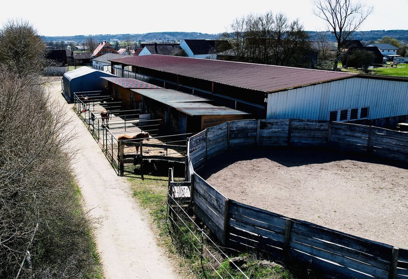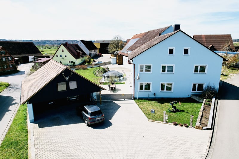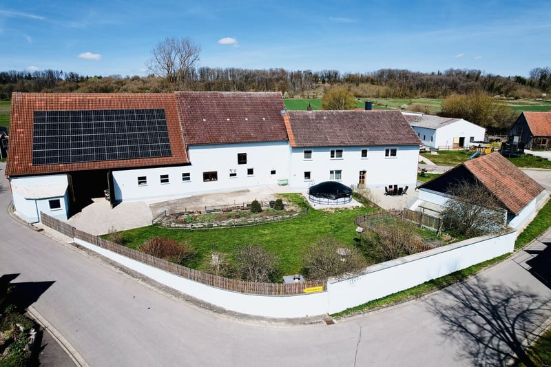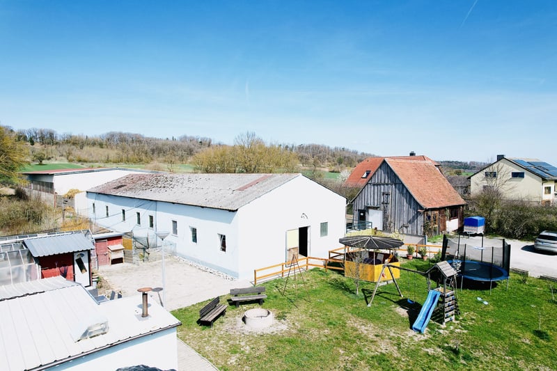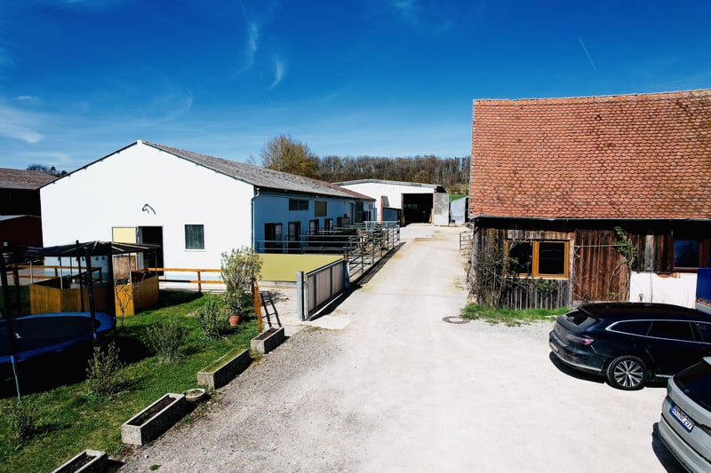 For sale is a versatile equestrian property located in a peaceful area of Leutershausen, district of Steinberg. The property combines spacious living accommodations with extensive infrastructure for horsekeeping, offering attractive prospects for both private and commercial users. The estate encompasses approximately 3.5 hectares of pasture land, along with additional yard areas. The land is fenced and approved for horsekeeping, providing optimal conditions for species-appropriate animal care. The main residence offers around 320 m² of living space and is divided into two separate units. Its solid construction highlights the property's sturdy foundation. Recent modernization measures include triple-glazed windows (2012), façade work, and paving in the courtyard area (2022). The oil central heating system was also renewed in 2012. The estate features a riding hall measuring 17 x 44 meters, which was recently equipped with a new surface (2023). This ensures excellent training conditions regardless of weather. The stable facilities can accommodate up to 16 horses, with both box stalls and paddock boxes available. Additional features include ample turnout and exercise areas, as well as a functional infrastructure for daily operations. A further highlight is the existing barn, currently vacant, offering versatile usage options. The roof is fitted with a modern photovoltaic system with a capacity of approximately 20.64 kWp, including a 15 kW storage system, supporting sustainable and economical operation. Additional amenities include carport and parking spaces. A vaulted cellar and an attic provide further storage and utility options. This property is ideally suited for horse enthusiasts, riding farms, self-sufficient hobby farms, or investors seeking a property with development potential. The combination of living space, agricultural land, and equestrian infrastructure makes this a rare opportunity in the Ansbach region. ________________________________________ Summary: • Location: 91578 Leutershausen, Steinberg 6 • Land: approx. 3.5 ha pasture + yard area • Main house: approx. 320 m², 2 units • Riding hall: 17 x 44 m, new surface (2023) • Stables: capacity for approx. 16 horses • Barn: vacant, versatile use • Photovoltaic system: approx. 20.64 kWp + storage • Heating: oil, renewed in 2012 • Construction: solid masonry • Additional spaces: cellar, attic, parking spots ________________________________________ Location The property is situated in the district of Steinberg in the town of Leutershausen, Middle Franconia, Ansbach district. The area is characterized by a quiet, rural environment with extensive meadows and fields, offering ideal conditions for horsekeeping and country living. At the same time, it benefits from good connectivity to regional infrastructure. Leutershausen itself is only a few minutes’ drive away and provides basic services for daily needs. Here, you will find shops, bakeries, butchers, banks, doctors, and pharmacies. Additionally, there are kindergartens, primary and middle schools, as well as various leisure and sports facilities. Further educational institutions and a broader range of services are available in nearby Ansbach. Transport links are attractive for both individual travel and commuters. The B13 federal highway connects to Ansbach in approximately 15–20 minutes. From there, access to the A6 motorway (Heilbronn–Nuremberg) allows for quick travel to regional destinations. Nuremberg and Würzburg can each be reached in about 45 to 60 minutes by car. Public transportation is also well-connected: The Leutershausen-Wiedersbach train station is just a few minutes away and offers regular train services to Ansbach, Nuremberg, and Crailsheim. This makes the region accessible even without a car. The combination of a peaceful, nature-oriented location with excellent connectivity to major transportation routes makes this site particularly attractive—ideal for private owners as well as commercial concepts in horsekeeping or agricultural use.