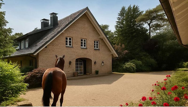 Ruiterfaciliteit voor de perfecte balans tussen gezinswoning en paardenpassie Het paardenpension, een ensemble van vier gebouwen, ligt vrij en volledig omgeven door groen op een perceel van circa 6,5 hectare tussen bos en weilanden. Het hoofdgebouw, ongeveer 520 m² groot, bevat vier zelfstandige wooneenheden met elk een eigen toegang. De ruime hoofdwoning van circa 344 m² beschikt over een gezellige open woonkeuken met kookeiland en voorraadkast in de entree. Een extra kamer, gecombineerd met een rolstoeltoegankelijke badkamer, dient als comfortabel gastenverblijf. Het hart van de begane grond is de lichte, ruime woonkamer met een zadeldak, grote raampartijen, terrasdeuren en een gezellige tegelkachel. Een klein kantoor is vanuit de woonkamer bereikbaar. Via een massiefhouten trap is de overdag verlichte galerie met bibliotheek te bereiken. Aangrenzend aan de woonkamer bevindt zich een grote hal die leidt naar twee lichte kinderkamers met volledige badkamer, een wasruimte en via een tweede trap het zadeldak-slaapkamer met badkamer en suite, dakbalken en uitzicht op de nok. De bovenverdieping herbergt tevens een medewerkerswoning van circa 70 m² met open zolderruimte en nog een ca. 100 m² grote woonunit. Alle woningen beschikken over een eigen ingang. Technisch gezien is het erf modern uitgerust met vloerverwarming, een BUS-systeem, traditionele ramen met moderne isolatie, een elektronische sluitinstallatie en een airconditioning in de hoofdslaapkamer. Eigen grondwaterwinning, een redundante oliecentrale, regenwaterafvoer voor de weilanden en een zonne-energiepotentieel zorgen voor toekomstbestendigheid en onafhankelijkheid. Voor een diervriendelijke en gepassioneerde paardenhouderij biedt de faciliteit uitstekende voorwaarden: acht boxen in de hoofdstal met zadelkamer, ruiterhokje, wasbox en hooinstallatie. Tien extra buitenboxen, inclusief een tweede zadelkamer, wachten op nieuwe dieren. Een lichte rijhal met verlichting, een grote paddock en meerdere weilanden met schaduwplekken en drinkbakken bieden optimale omstandigheden voor training en vrije beweging. Direct grenzend starten rijroutes door velden, bossen en weiden – een genot voor ruiter en paard het hele jaar door. Thuis zijn in je eigen leven, wie zou dat niet willen? Op deze unieke locatie wordt dit nieuwe geluk voor jou, je gezin en je paarden werkelijkheid, zonder grenzen. Indeling van de woning op Niederrhein Verdeling naar wooneenheden met woonoppervlakte (circa, in m²). Opmerking: de wooneenheden zijn flexibel samen te voegen of apart te gebruiken. Momenteel vormen wooneenheden 1 en 2 één geheel van circa 344 m²: woonkeuken, garderobe/entree, keuken, berging/voorraad, gastenverblijf, gang, badkamer, woonkamer met galerie/bibliotheek, kantoor, technische ruimte. Hal, 2 kinderkamers, wasruimte/techniek, badkamer, hoofdslaapkamer op de bovenverdieping, badkamer en suite, gang, inloopkast en bergruimte. Wooneenheid 3 – ca. 70 m² (medewerkers): wonen/eetkamer, keuken, garderobe, berging, gang, badkamer, slaapkamer, zolder (geen afbeelding). Wooneenheid 4 – ca. 100 m² (gasten/familie): hal/wonen/eetkamer, garderobe, badkamer, 2 slaapkamers, keuken, berging, zoldergalerie. Technische voorzieningen: vloerverwarming, moderne ramen/deuren in landhuisstijl, BUS-systeem, elektronisch slotensysteem, airconditioning in de hoofdslaapkamer, eigen grondwaterwinning, moderne oliekachel (dubbelbrand), regenwaterafvoer voor de weilanden, driekamersysteem. Faciliteiten van het paardenpension Hoofdstal met 8 paardenboxen, zadelkamer, ruiterhokje, badkamer met douche, wasbox en opslag voor voer en levering. Buitenboxen met 10 boxen, eigen zadelkamer en drinkbakverwarming. Lichtoverdekte rijhal (ca. 16,5 x 35 meter) met aansluitend hooi- en stroopslag. Grote rijbaan (ca. 60 x 30 meter), in de buitenruimte vijf weilanden met schaduwplekken en drinkbakken, regenwaterafvoer voor de terreinen. Twee aparte betonnen poetsplaatsen, fruitboomgaard met oude bomen. Directe aansluiting op rijroutes door het omliggende landschap in het natuurpark Hohe Mark. Bijzonderheden voor paardenhouderij: Verwarmde drinkbakken in de buitenboxen – betrouwbare watervoorziening ook in de winter. Eigen grondwaterwinning voor stal en terrein – onafhankelijke, kostenefficiënte voorziening. Regenwaterafvoersysteem voor directe watervoorziening van de weilanden. Directe toegang tot schilderachtige rijroutes in het natuurpark Hohe Mark. Privé locatie in idyllische omgeving aan de Niederrhein Het landgoed ligt afgelegen binnen de gemeente Hünxe aan de Niederrhein, in het Regierungsbezirk Düsseldorf. Het is omgeven door een landschap van gemengd bos, velden en weilanden. De locatie biedt directe toegang tot schilderachtige rijroutes in het natuurpark Hohe Mark. Hünxe ligt aan de westelijke rand van het Ruhrgebied en combineert het beste van twee werelden: een landelijke omgeving met directe aansluiting op het Ruhrgebied. De gemeente wordt beschouwd als een rustige, leefbare plek in de zogenaamde randstad – populair bij gezinnen, forenzen en iedereen die waarde hecht aan kwaliteit van leven. De omgeving rondom Hünxe heeft bovendien een hoog recreatief waarde: wandelingen langs het Wesel-Datteln-kanaal, door het Hünxer Bachtal of het Dämmerwald, evenals uitgebreide fietstochten – zonder stadsverkeer. Ook het recreatieaanbod is gevarieerd: een overdekt zwembad, meerdere tennisbanen en de golfclub Weselerwald met bijbehorende horeca liggen in de buurt. Een uitstekende wellnessfaciliteit, Livingroom SPA, bevindt zich in het nabijgelegen 4-sterren Landhotel Voshövel. De Gesamtschule Hünxe biedt moderne onderwijsconcepten in een levendige schoolgemeenschap. Kindergärten zijn eveneens goed bereikbaar. Wij presenteren deze woning in samenwerking met immobilienteam.de