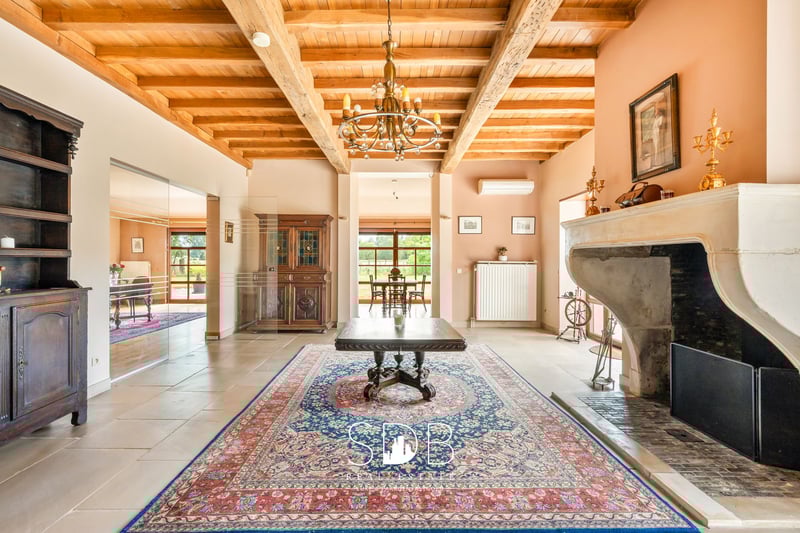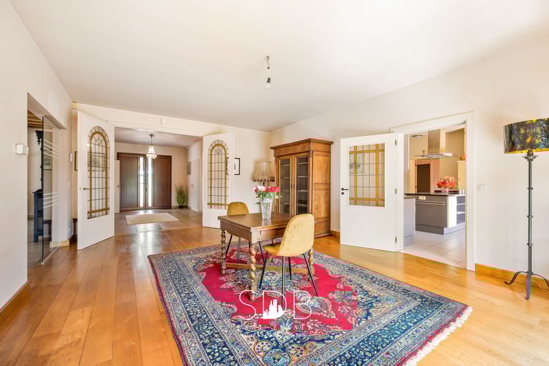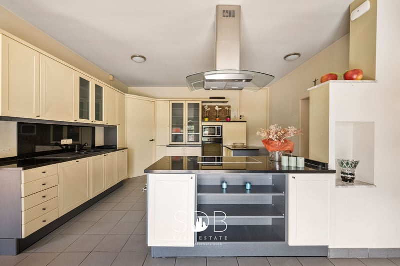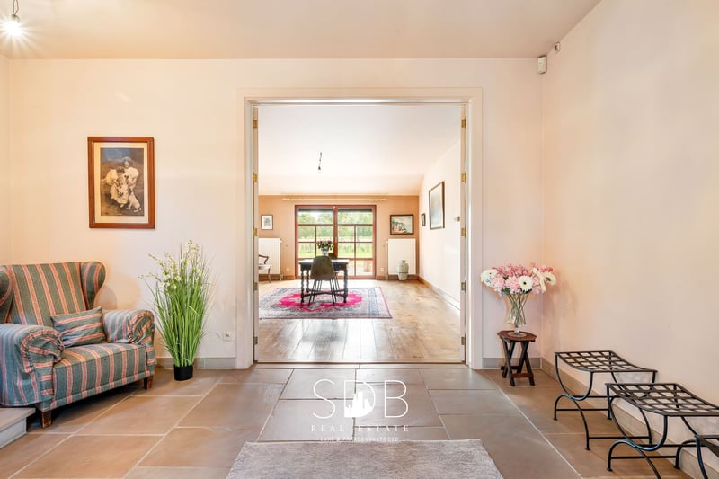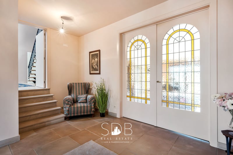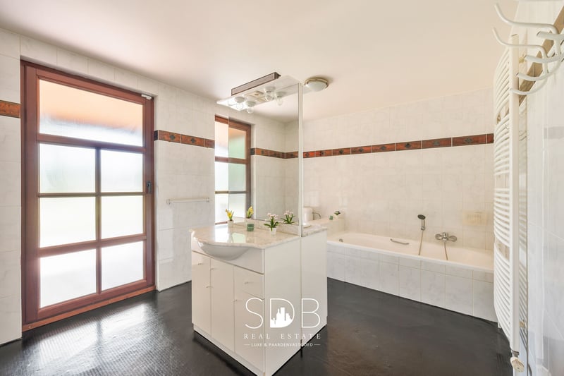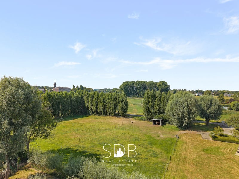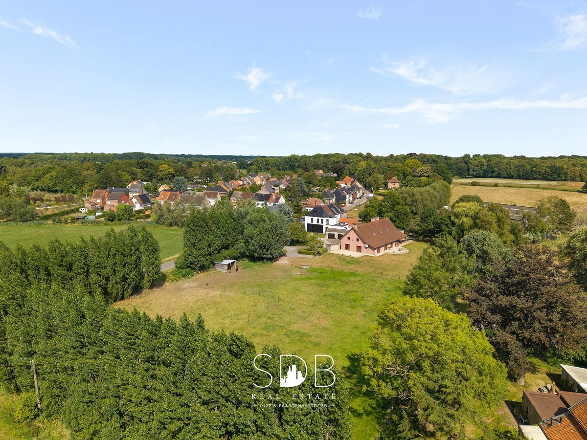 In the province of East Flanders, in Destelbergen, we present this contemporary villa with pastures on a 7,496 m² plot. A suburb of Ghent, ideally located with excellent connections and major access roads, such as the E17 and E40. An excellent combination of urban amenities and rural tranquility. We enter the property through the spacious entrance hall. What immediately stands out in this home are the fully proportioned, generous living spaces filled with natural daylight. Adjacent to the entrance is a living/dining area, connected via a stylish glass door to the bright living room featuring a characterful fireplace and a separate seating area. The modern, fully equipped kitchen offers all necessary facilities. From the kitchen, you have direct access to the terrace—perfect for summer aperitifs. These ground-floor living areas provide beautiful views of the garden and the surrounding greenery, namely the pastures behind the property. On the same level, there is also a large, versatile room that can be used as desired. Additionally, there is a bathroom fitted with a single washbasin unit and a bathtub. A second bathroom is also available, equipped with a single washbasin, a shower, and a bathtub. On the first floor, there are four fully functional bedrooms. This level also features a bathroom with a single washbasin, a shower, and a bathtub. The upper floor offers potential to be converted into a separate living unit or loft, as it has a dedicated entrance directly connected to this level. The living spaces are spacious enough to accommodate this, while maintaining privacy and comfort. The property includes four indoor garages and additional parking spaces at the front. Outside, you will find the family garden with surrounding greenery and enclosed pastures, designed with a stable for housing animals and/or horses. These pastures are ideal for animal lovers who wish to keep their animals or horses close by. From the house, you can enjoy watching your animals graze. Given the size of this property, it is well-suited to accommodate multiple families or blended households. It could also serve as co-housing or a care home. Notable features include technical amenities such as an alarm system, automatic shutters, and a heat pump. Interested in this contemporary villa where peace, nature, and adjoining pastures come together? Don’t hesitate to contact us. We’d be happy to tell you more! www.sdb.realestate