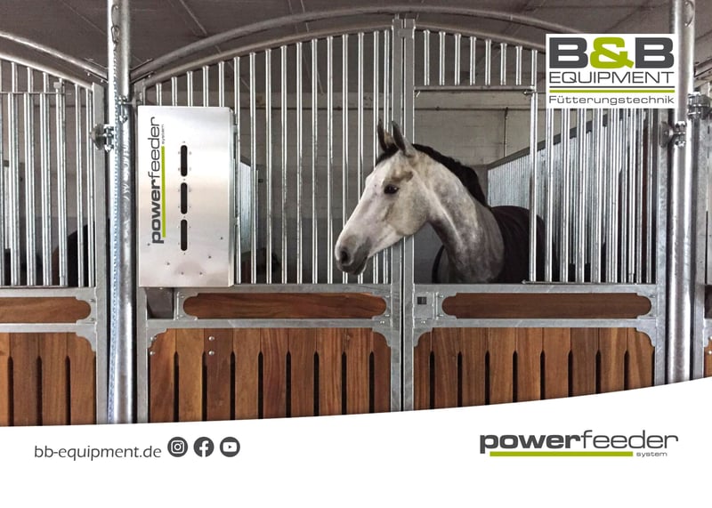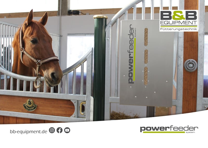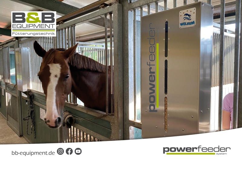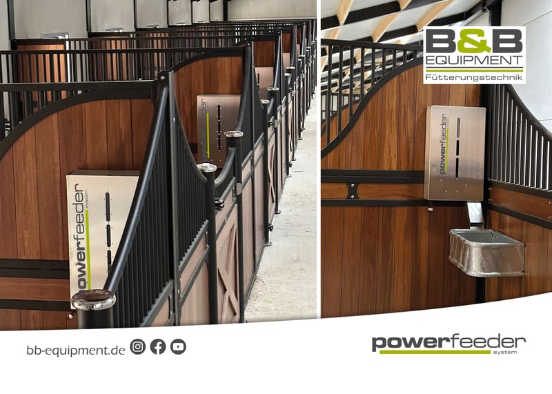 Guten Tag, Das powerfeeder-System ist der automatische zeitgesteuerte Kraftfutterautomat vom Fohlen- bis Seniorfutter. Für mehr Gesundheit und Wohlbefinden für Ihr Pferd. Für Sie mehr Zeit mit Ihrem Pferd. 24/7 wird Ihr Pferd mit unserem powerfeeder-System versorgt. Das powerfeeder-System verfügt über unterschiedliche Modelle und kann von Pellet, Hafer, Gerste bis hin zum Seniorfutter mit viel Struktur und Melasse. Durch viele kleine gesunde Portionen wird Ihr Pferd das Kraftfutter besser verwerten können, zudem ist es magenschonender. Der powerfeeder ist aus Edelstahl und 100% nachrieselfrei und lässt sich spielend leicht programmieren. Betrieben werden kann der powerfeeder im Netzstrom, Akku oder AkkuSolar. Gerne sind wir Ihr Ansprechpartner für die zeitgesteuerte Fütterung Ihrer Pferde. Auch für Sonderanfertigungen, mit denen Spezialfutter wie Luzerne, faserige Futtersorten oder pulverartige Mineralfuttersorten zugeteilt werden sollen, haben wir die passende Lösung und eigens entwickelte Spezialfuttersysteme parat. In unserem Sortiment haben wir verschiedene Kraftfutterautomaten für verschiedene Futtersorten sowie die Option mit Bewässerung. Sprechen Sie uns an! Für Beratung und alle Fragen rund um unsere Futterautomaten und den zu realisierenden Möglichkeiten stehen wir Ihnen natürlich jederzeit gerne zur Verfügung. Wir freuen uns auf Ihre Nachrichten! B&B equipment GmbH Made in Germany