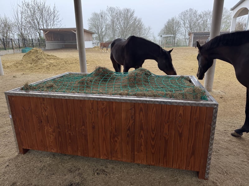 Hay rack made of hardwood for horses Robust, functional, and individual – our high-quality hay rack is made from solid hardwood and is ideal for daily use in the horse stable or pasture. Features: • Hardwood construction: Durable and weather-resistant • Bite protection: To protect the wood surface • Includes hay net and secure attachment device • Oiled surface: For additional protection and elegant appearance • Custom sizes available: We manufacture according to your desired dimensions • Optional roof: For additional protection in any weather Perfect for species-appropriate feeding and a tidy stable appearance. Inquire now and receive a custom offer! ⸻ Shipping possible - freight costs must be requested individually. The hay rack in the photo is designed for square bales measuring 230 x 135 x 73 cm and feeding space for approximately 5 horses. This size is priced at 1390 euros.